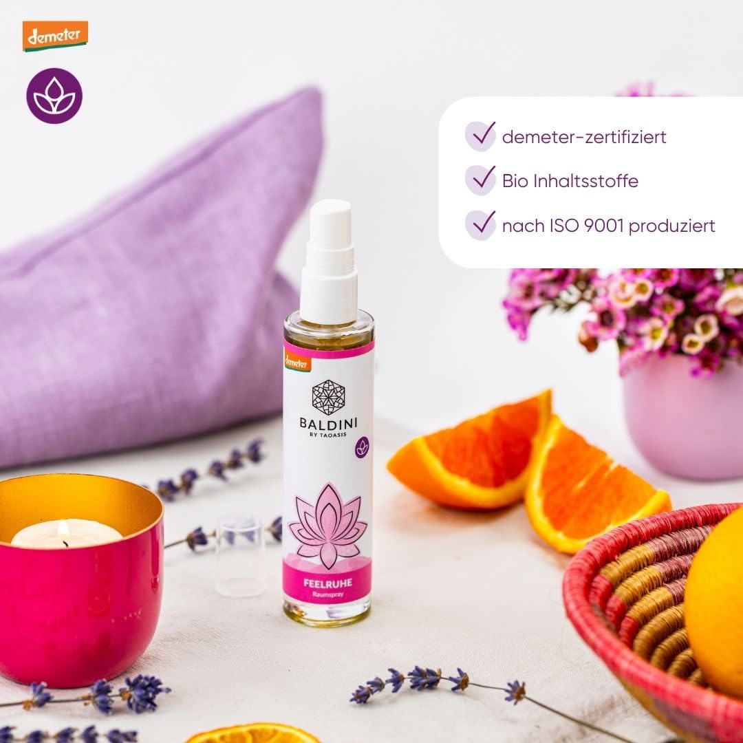 Das Demeter-Raumspray aus 100 % naturreinen, ätherischen Ölen und BIO-Alkohol in einer hochwertigen Glasflasche mit Pump Sprüher. Baldini Feelruhe ist der wohltuende und entspannende Naturduft mit Lavendel, Benzoe und Orange.