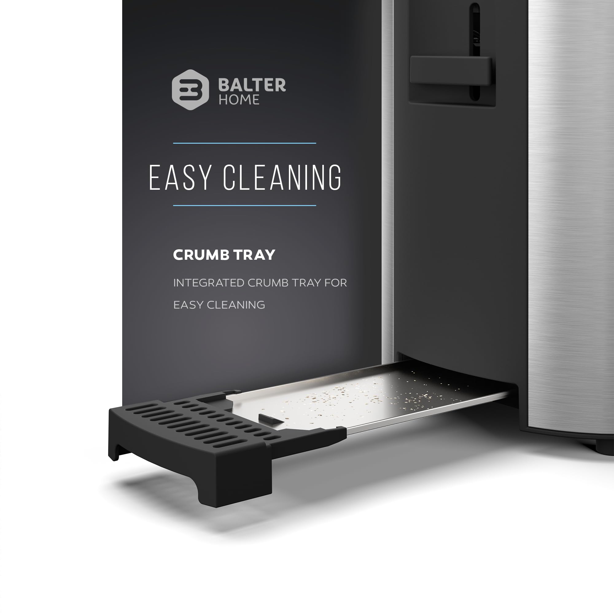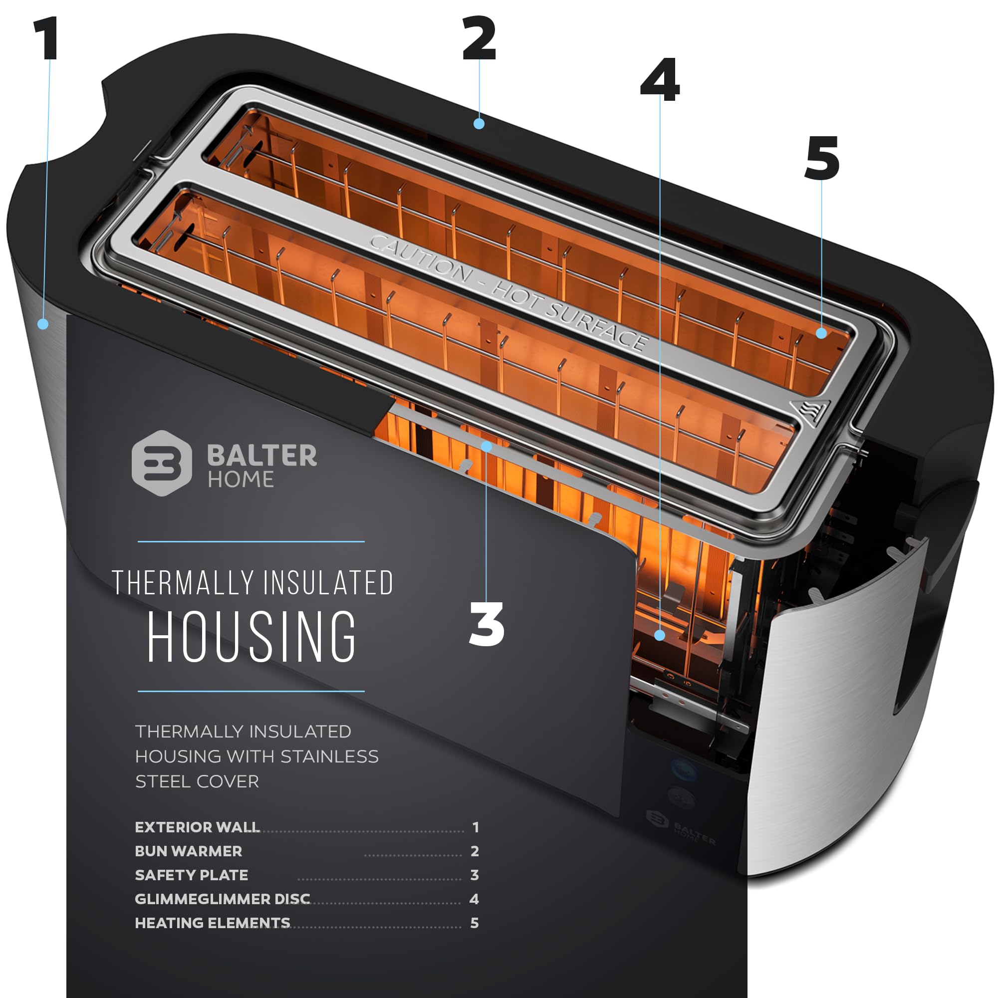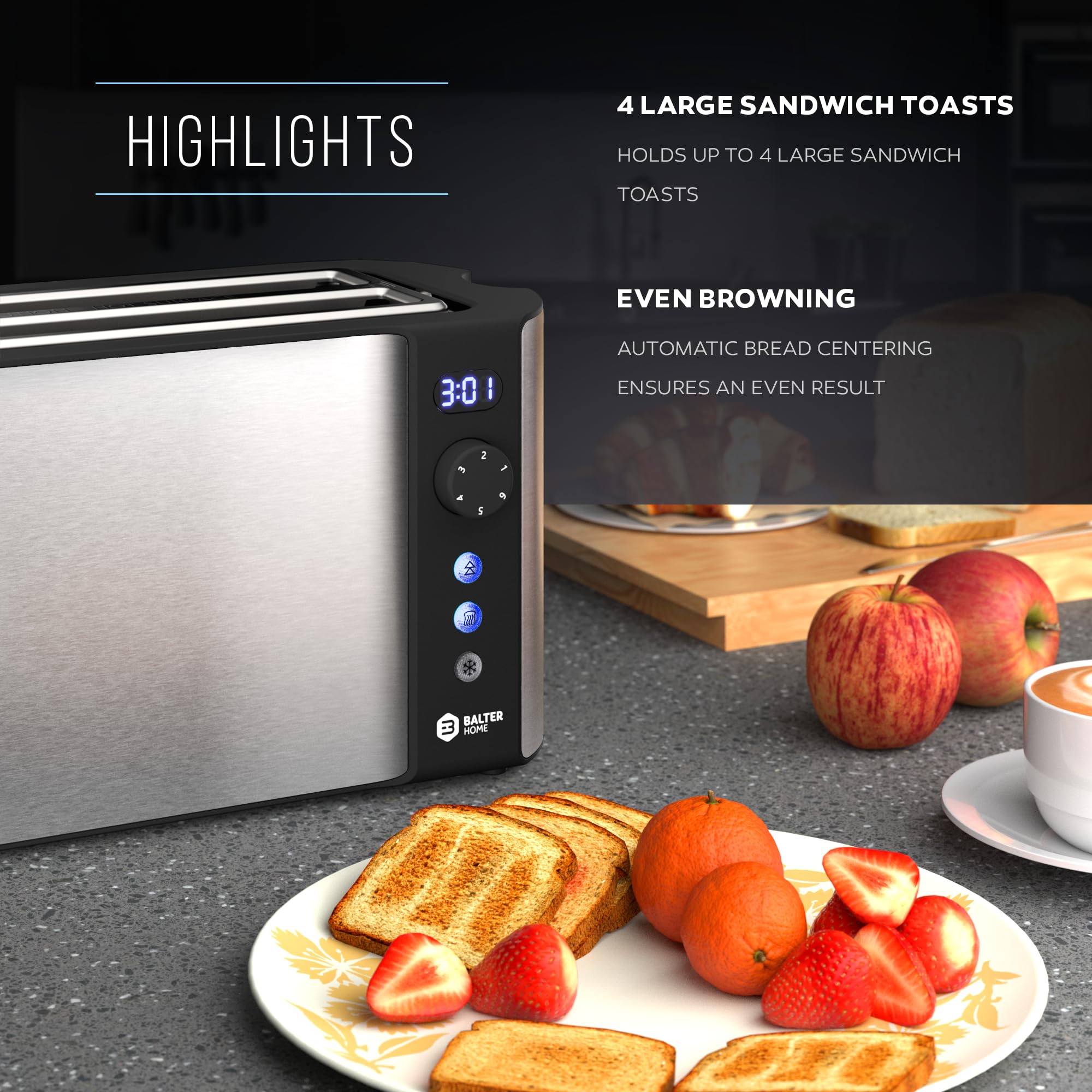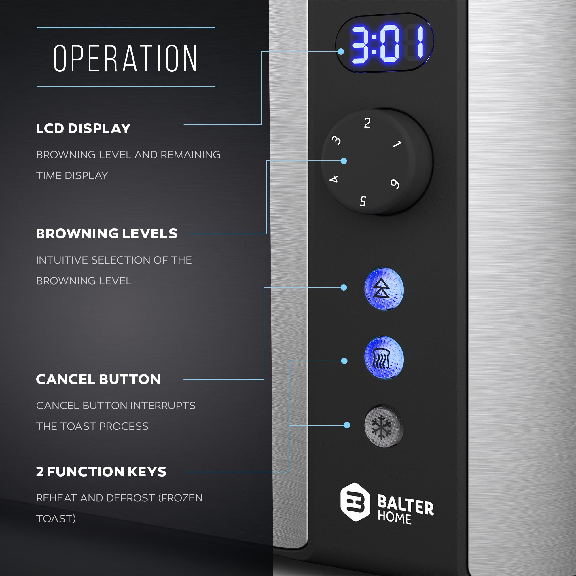 Balter Toaster 4 Scheiben, Langschlitz, Edelstahl, Brötchenaufsatz, LCD Display mit Restzeitanzeige, Auftaufunktion, Brotzentrierung, Krümelschublade, TS-04-LCD, Farbe: Silber