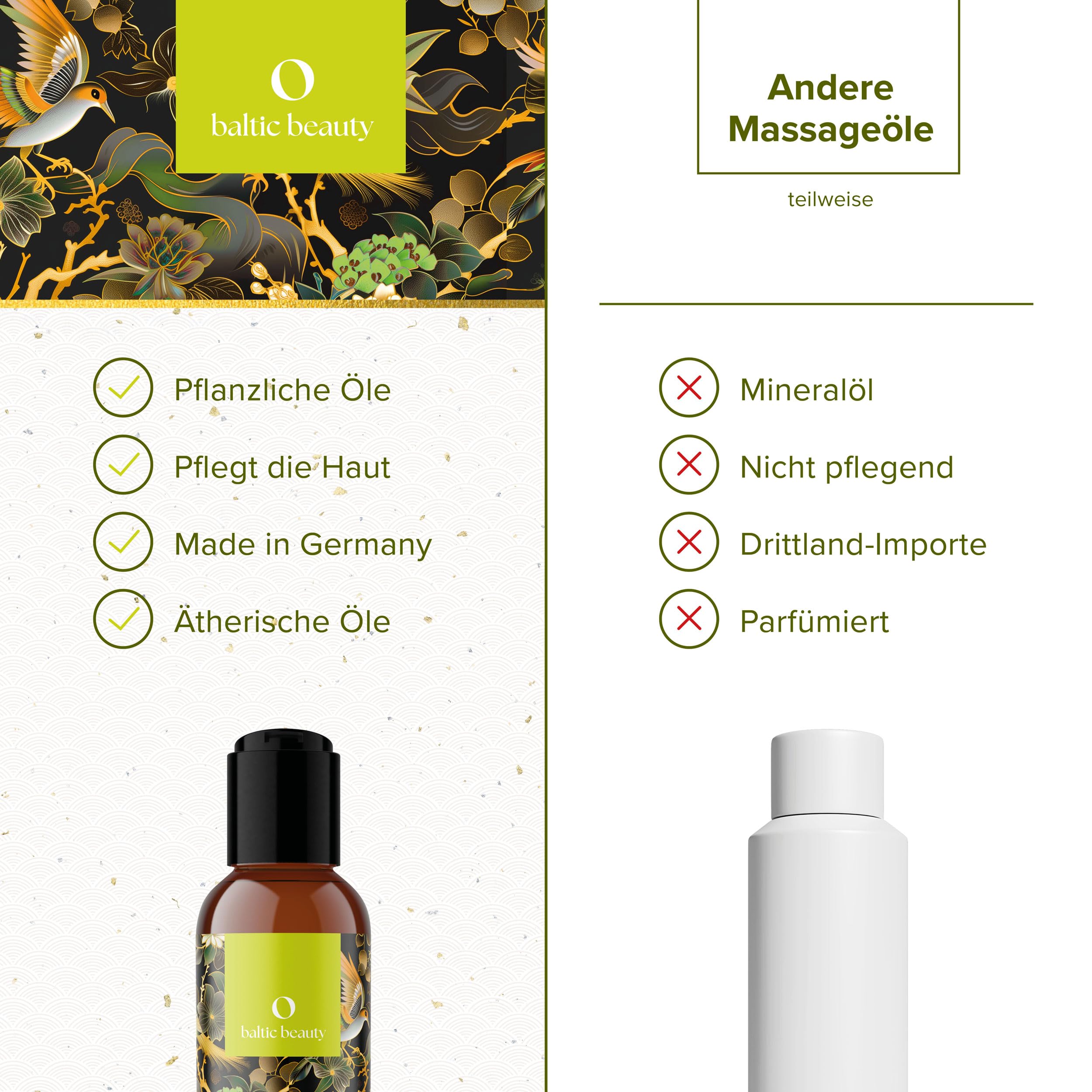 • Natürliche Inhaltsstoffe für sanfte Pflege - Die exklusive Mischung aus pflegenden Ölen versorgt die Haut intensiv mit Feuchtigkeit und macht sie weich und geschmeidig, ideal für entspannende Massagen.