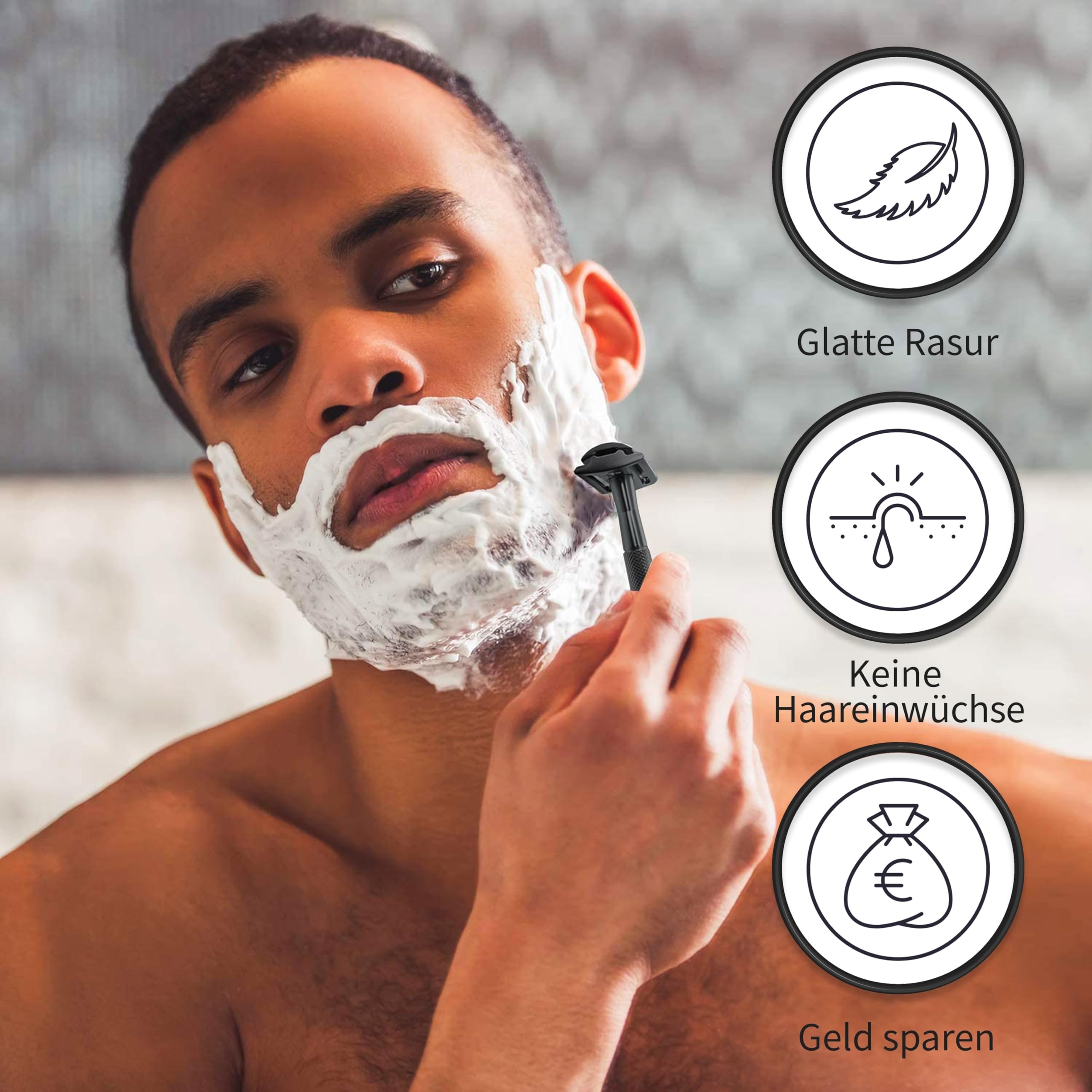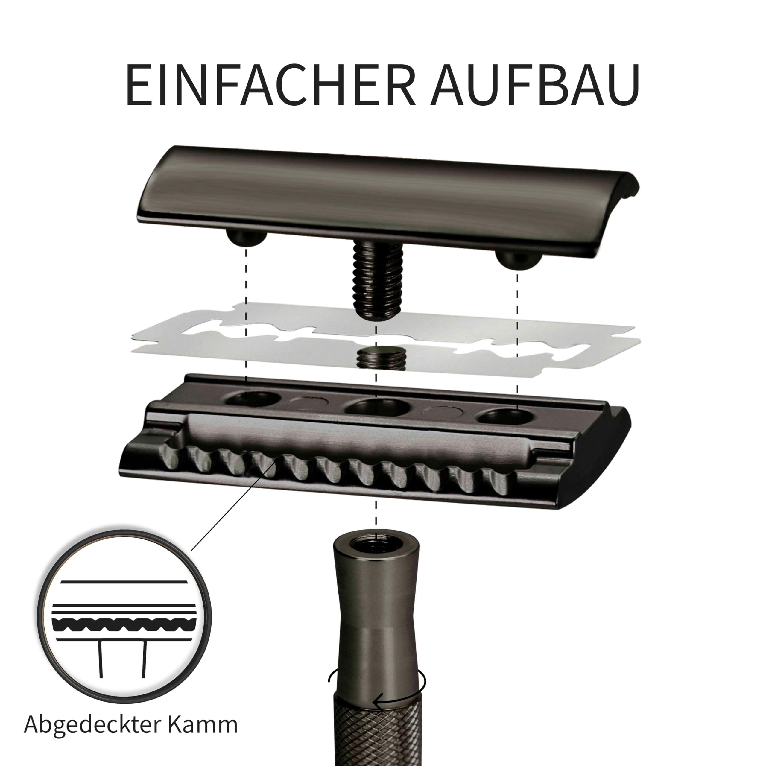 Bambaw Rasierhobel Herren mit Ständer und 5 Rasierhobel Klingen, Metall Rasierer Herren mit Geschlossenem Kamm Für Eine Präzise & Sanfte Rasur, Ausgeglichenes Gewicht für Volle Kontrolle (Schwarz)