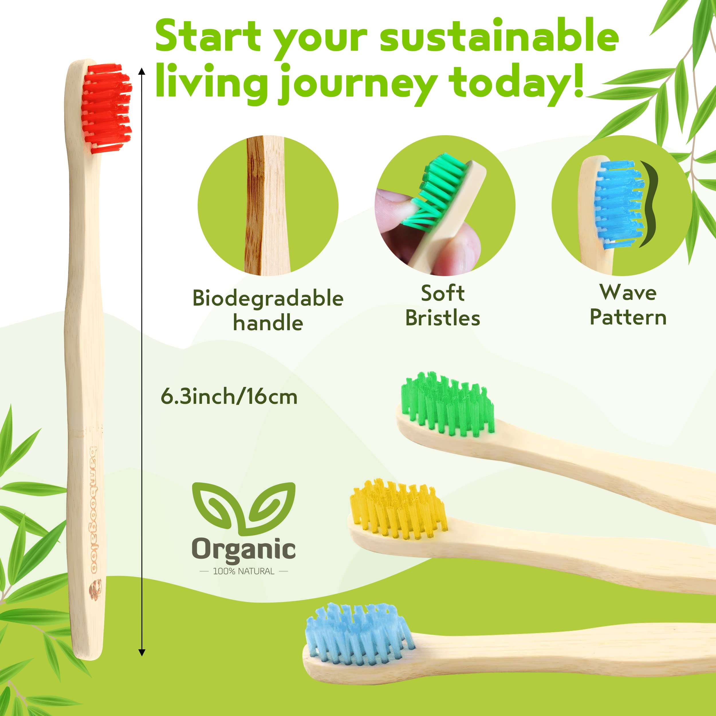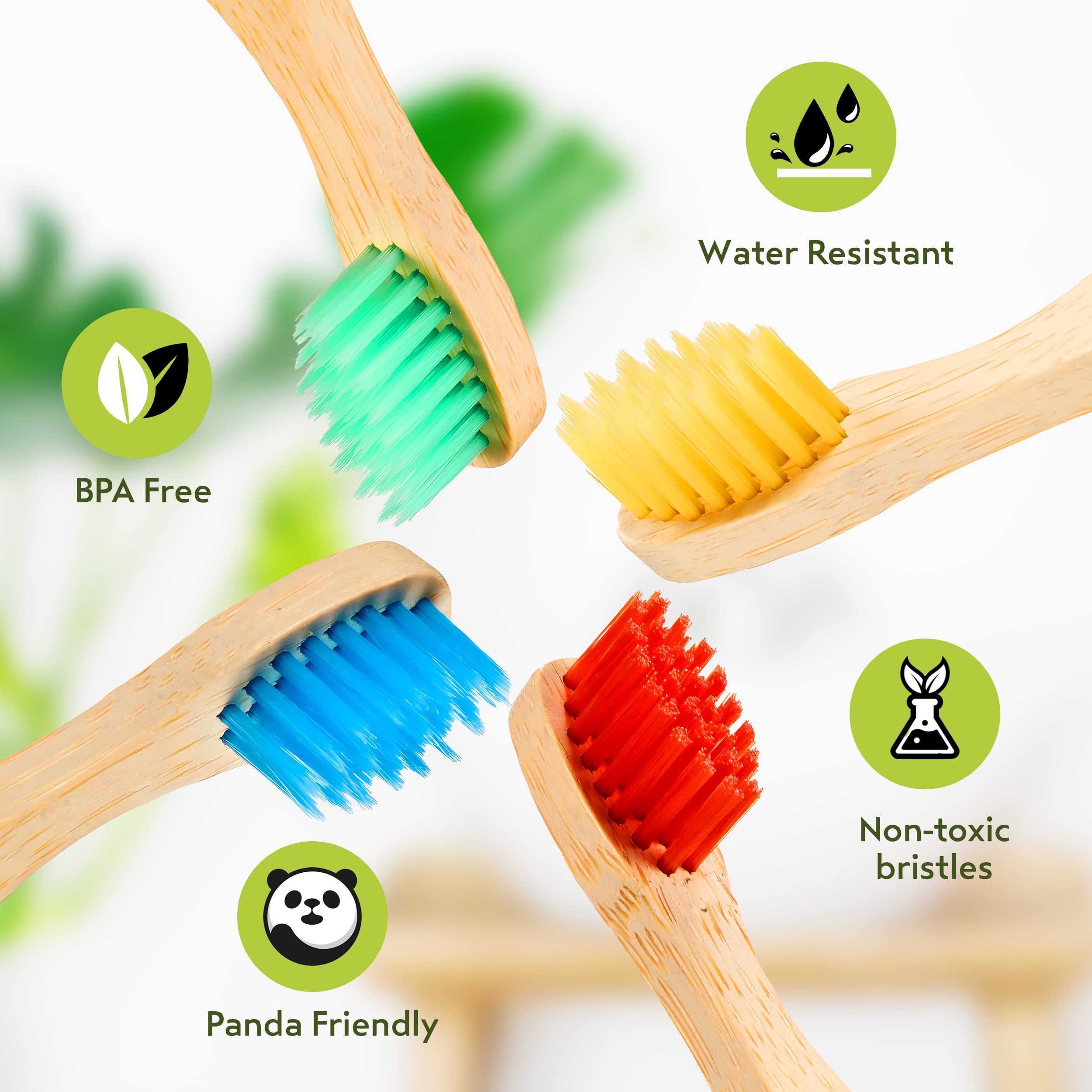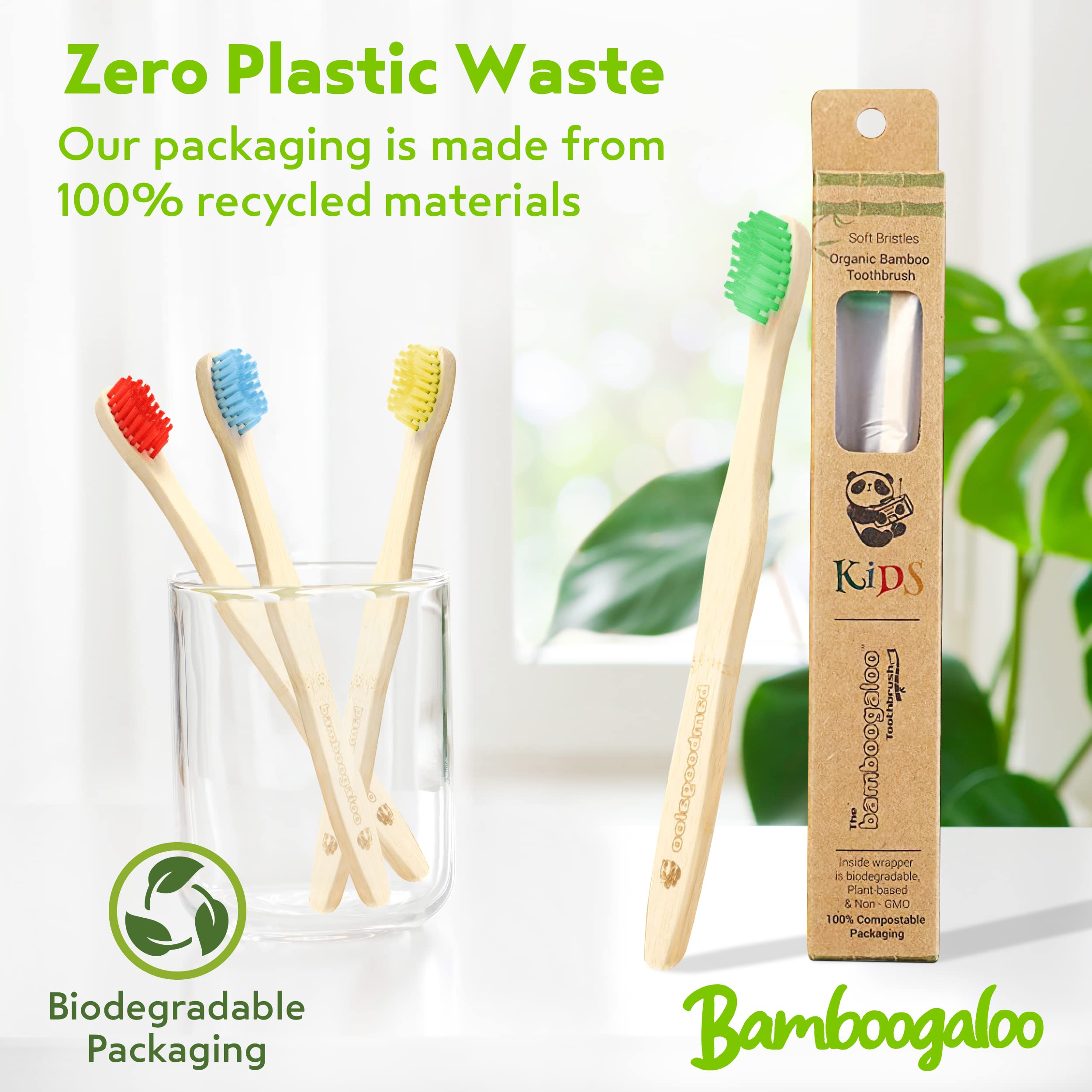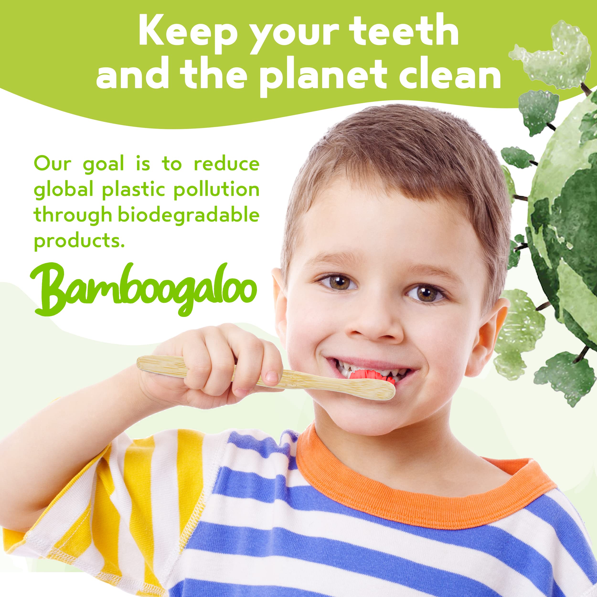 BAMBOOGALOO Kids Bambus Zahnbürsten | Bio & Umweltfreundlich | 4er Pack mit kostenlosen Bambus Wattestäbchen | Kinderzahnbürste aus Naturholz | Weiche BPA-freie Borsten | Biologisch abbaubare Box