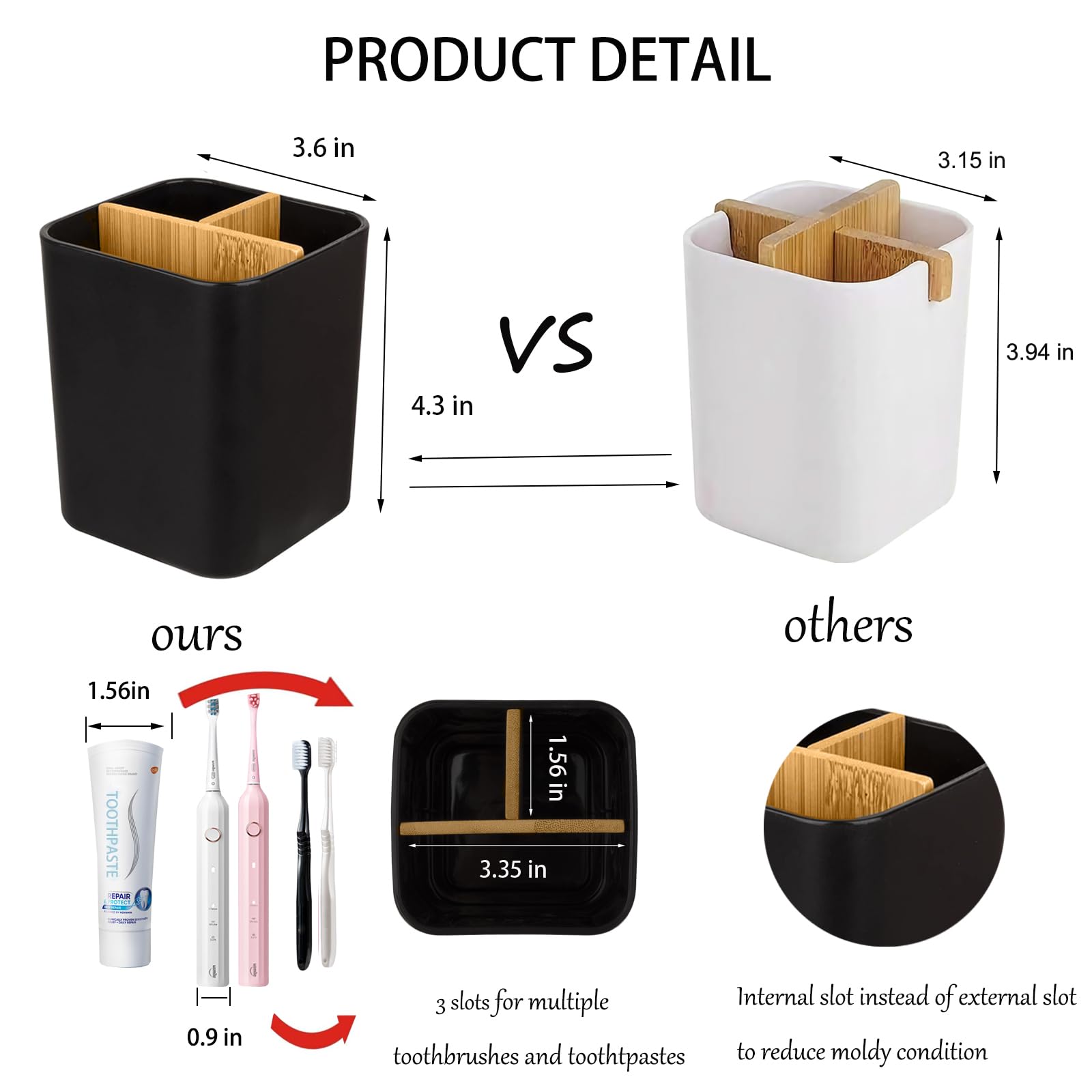 Bambus-Zahnbürstenhalter mit 3 multifunktionalen Schlitzen für Badezimmer, Zahnbürste und Zahnpasta, Organizer für elektrische Zahnbürsten, Zahnpasta, Rasierer, Badezimmer-Theken-Organizer – Schwarz