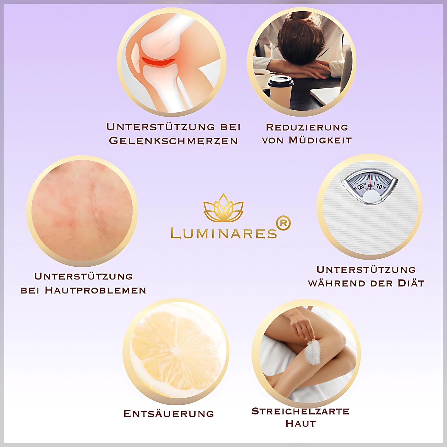• Das Luminares Edelstein Basenbad eignet sich hervorragend zur basischen Körperpflege. Unsere spezielle Mischung hochwertiger Salze unterstützt die basische Reinigung und selbstrückfettung der Haut und sorgt somit für ein angenehmes geschmeidiges Hautgefühl.