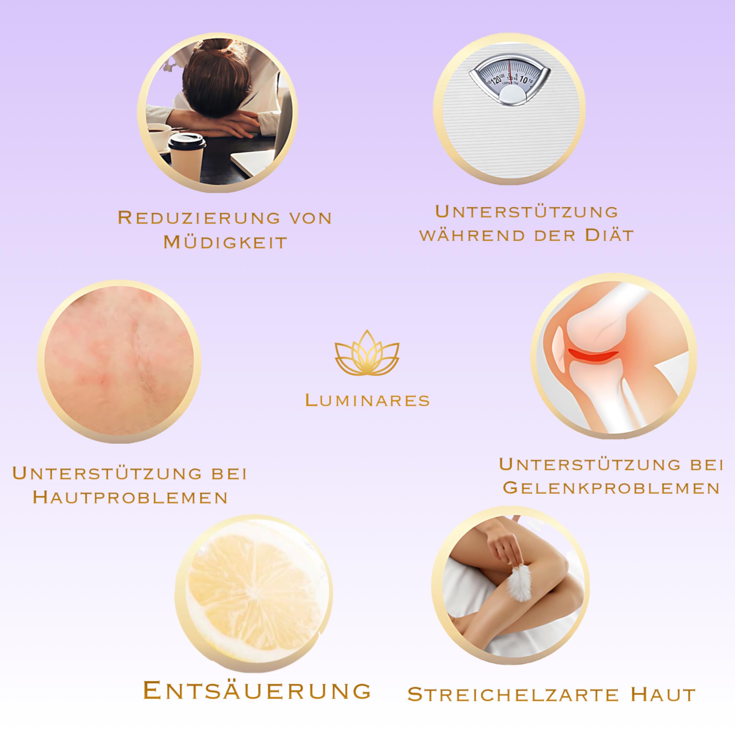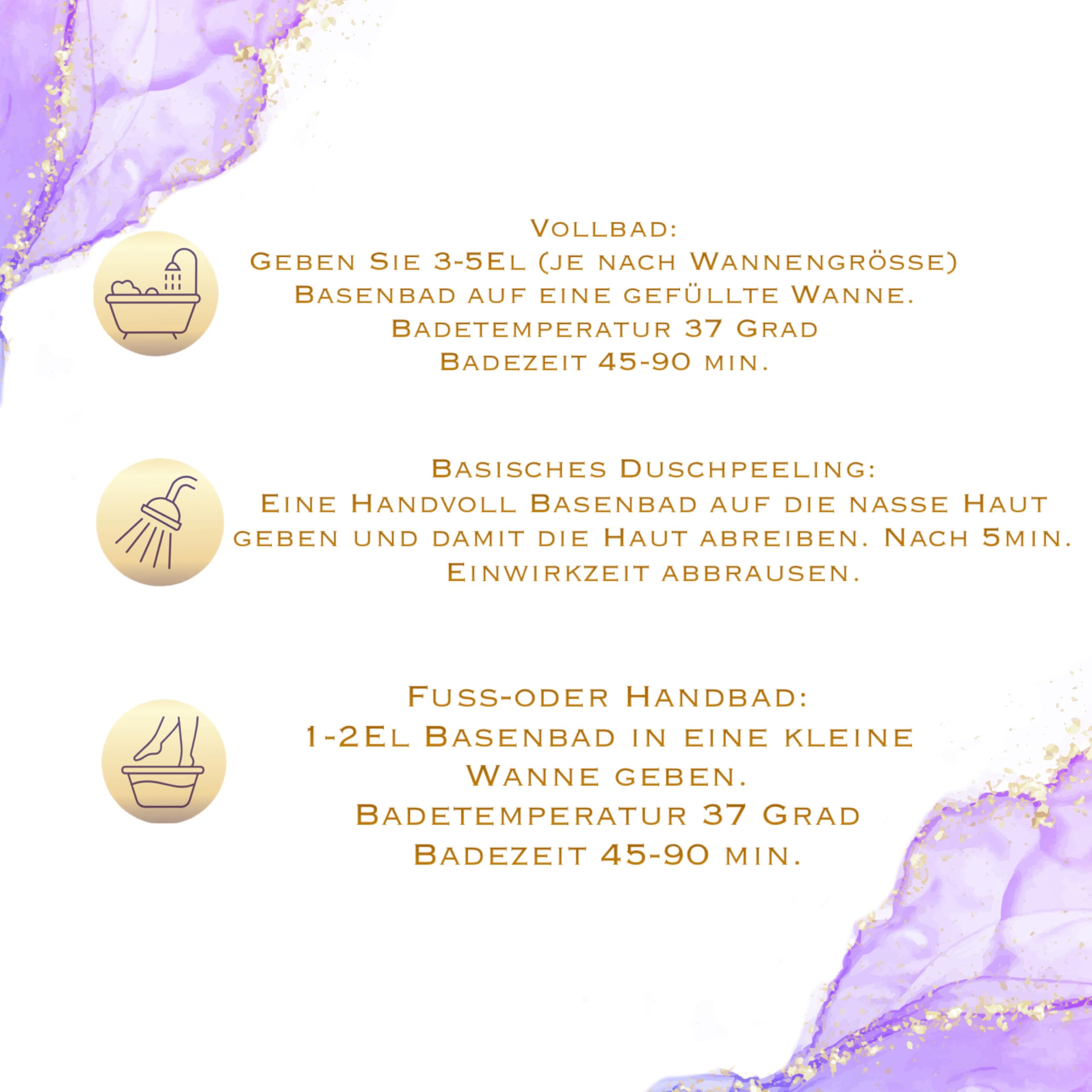 Die Dauer des Basenbades sollte 45min nicht unterschreiten, besser jedoch länger betragen. Vor Gebrauch kurz schütteln. Vollbad: geben Sie 3-5EL (je nach Wannengrösse) Basenbad auf eine gefüllte Wanne. Badetemperatur 37 Grad Badezeit 45-90min. Für optimale Ergebnisse auf weitere Badezusätze, Seifen o.ä. verzichten. Tipp: Zwischendurch die Haut mit einem Waschhandschuh oder einer Badebürste abreiben. Nach dem Bad, das Wasser nur abstreifen und in einem Baumwollhandtuch oder Bademantel ruhen. Im Sommer die Haut einfach an der Luft trocknen lassen. Fuss-oder Handbad: 1-2 El Basenbad in eine kleine Wanne geben. Badetemperatur 37 Grad. Badezeit 45-90min. Basisches Duschpeeling: Eine handvoll Basenbad auf die nasse Haut geben und damit die Haut abreiben. Nach kurzer Einwirkzeit abbrausen. Zur Vorbeugung von Schweissgeruch auch im Achselbereich anwendbar. Basische Wickel: 1-2 EL Basenbad in 1/2 Liter warmen Wasser auflösen, ein Baumwolltuch damit befeuchten und auf die gewünschte Körperstelle auflegen. Warm und trocken abdecken(Seide oder Wolle) und 30-90 min. ruhen, oder über Nacht einwirken lassen.