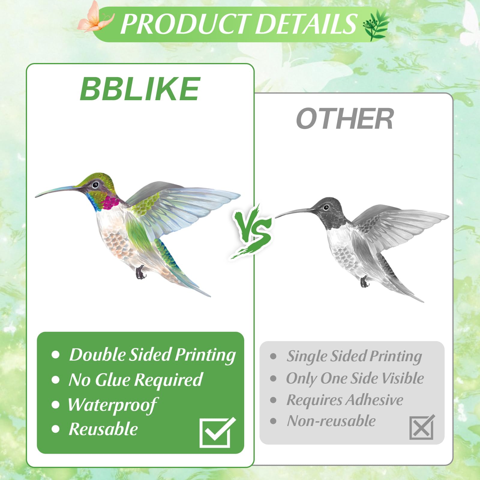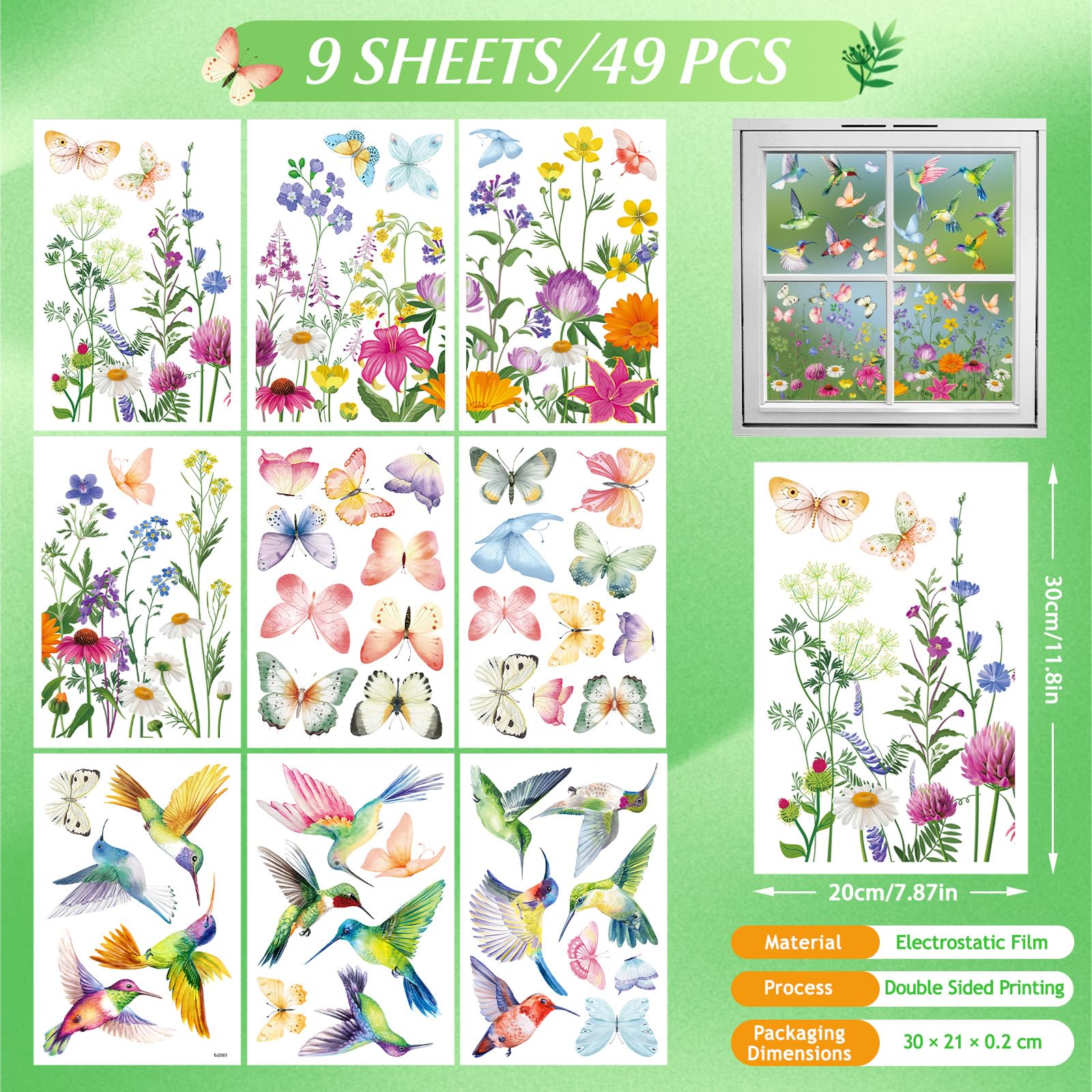 BBLIKE 9 Blätter Frühling Fensterbilder - Kolibri Blume Selbstklebend Doppelseitig Bedruckt Fenstersticker, Wiederverwendbare Fensterbilder für Fensterdeko