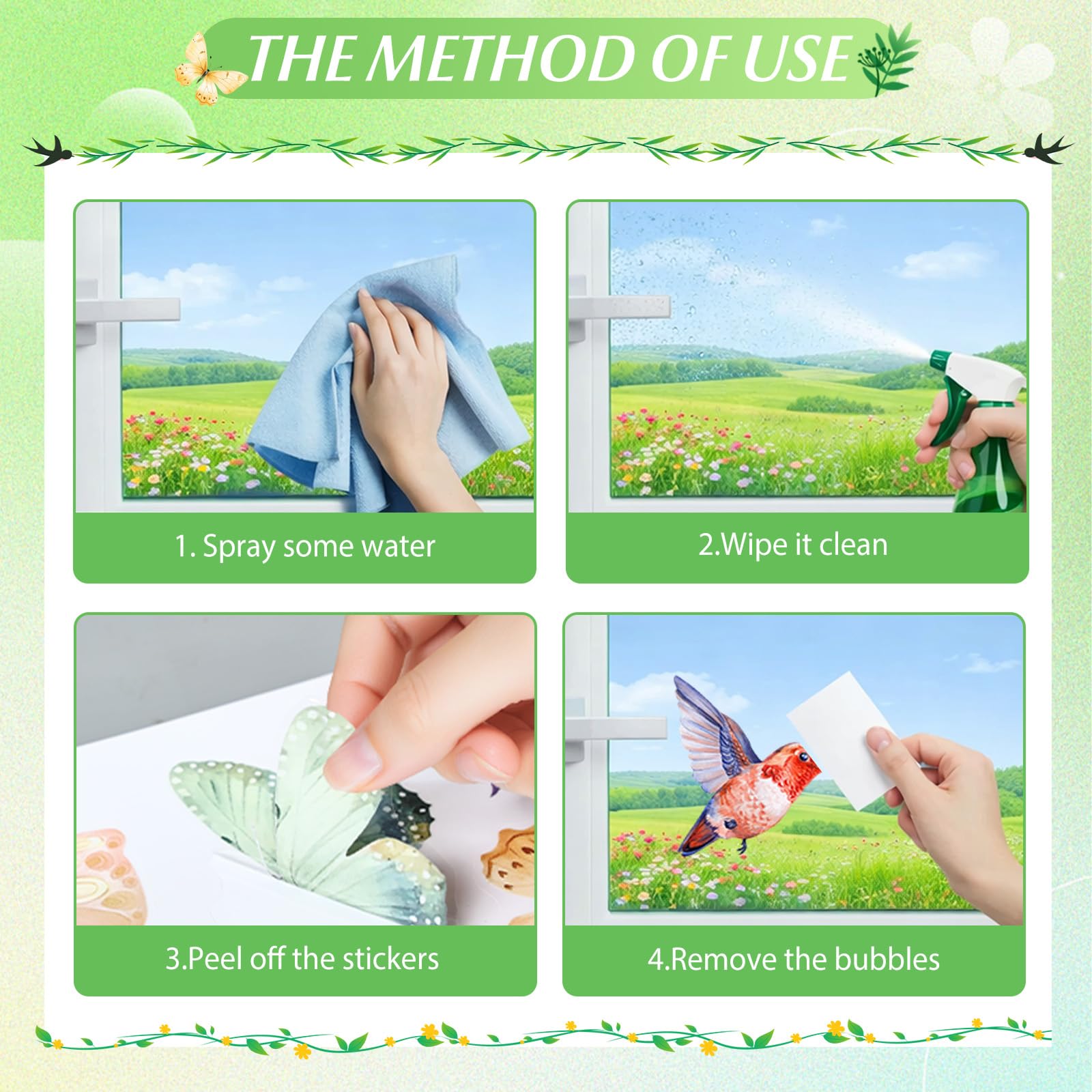 Einfach und bequem zu verwenden, kein Kleber erforderlich: Bevor Sie die Fensteraufkleber auf das Fenster kleben, müssen Sie etwas Wasser auf das Fenster sprühen und es sauber wischen. Wenn Luftblasen auftreten, lassen Sie das Wasser von Hand oder mit einem Werkzeug ab. Hinweis: Bitte achten Sie darauf, dass die Oberfläche glatt und sauber ist. Nicht geeignet für schmutzige oder raue Oberflächen wie graue Wände, schmutzige Wände, raue Wände.