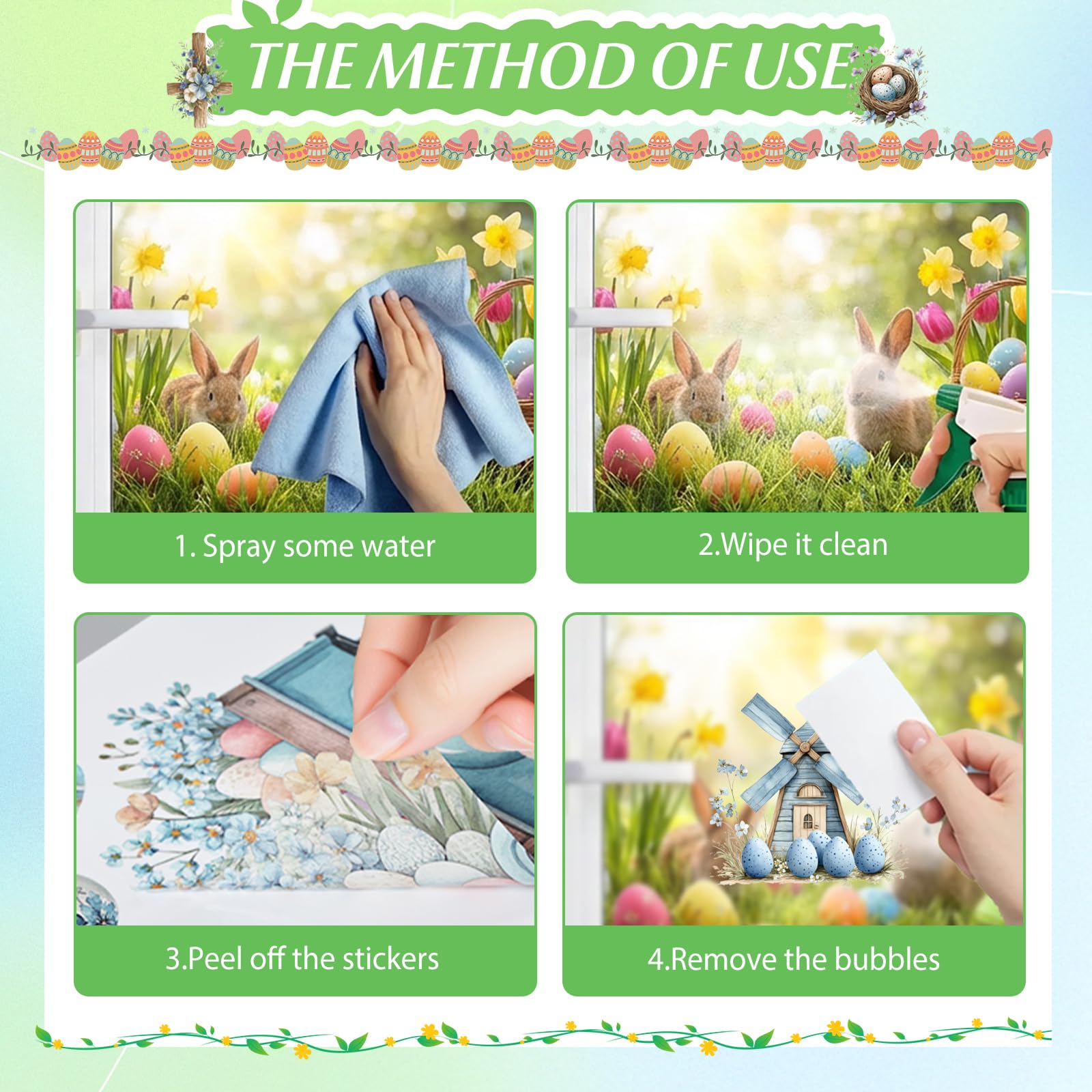 Einfach und bequem zu verwenden, kein Kleber erforderlich: Bevor Sie die Fensteraufkleber auf das Fenster kleben, müssen Sie etwas Wasser auf das Fenster sprühen und es sauber wischen. Wenn Luftblasen auftreten, lassen Sie das Wasser von Hand oder mit einem Werkzeug ab. Hinweis: Bitte achten Sie darauf, dass die Oberfläche glatt und sauber ist. Nicht geeignet für schmutzige oder raue Oberflächen wie graue Wände, schmutzige Wände, raue Wände.