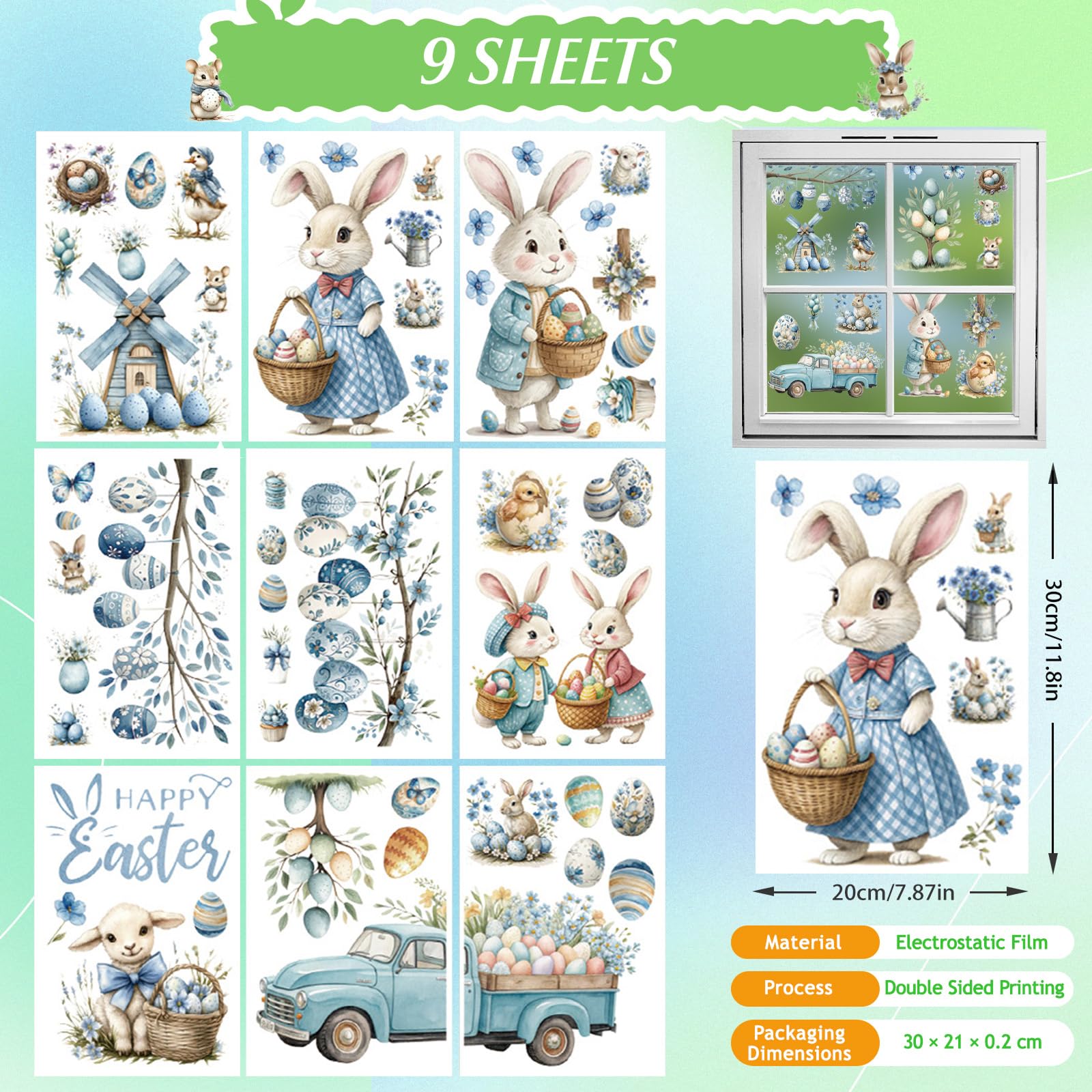 BBLIKE 9 Blätter Ostern Fensterbilder - Gefärbte Eier Häschen Selbstklebend Doppelseitig Bedruckt Fenstersticker, Wiederverwendbare Fensterbilder für Fensterdeko