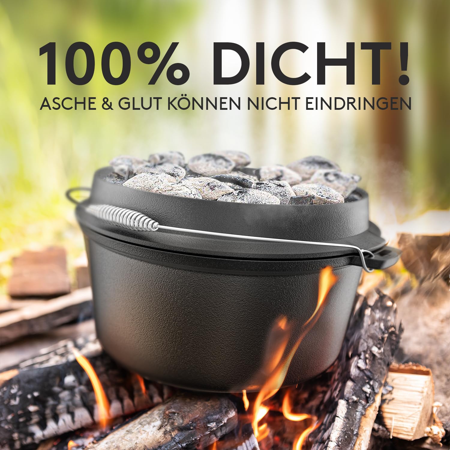 BBQ Dutch Oven [Das Original] - Dutch Oven Set 10,8 Liter – Eingebrannter Feuertopf aus Gusseisen Deckel & Topfständer – inkl. Deckelheber und e-Book