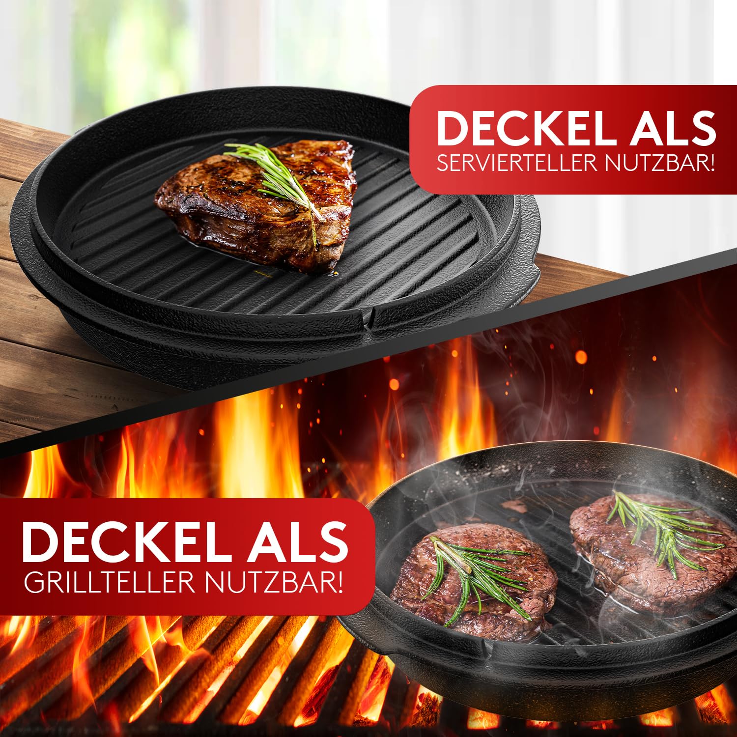 BBQ Dutch Oven [Das Original] - 10,8 Liter Dutch Oven Set mit Topfständer & 2,2 Liter Deckel mit Doppelfunktion zusätzlich als Grillpfanne nutzbar – inkl. Deckelheber und E-Book