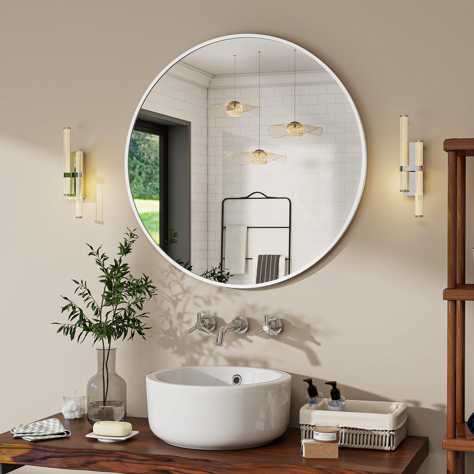 BEAUTYPEAK 90 cm Runder Spiegel, Bruchsicherer Wandspiegel mit Aluminiumrahmen, Badezimmer Spiegel zum Aufhängen und Anlehnen, Rund Wandspiegel für Schlafzimmer, Bad, Wohnzimmer Weiss