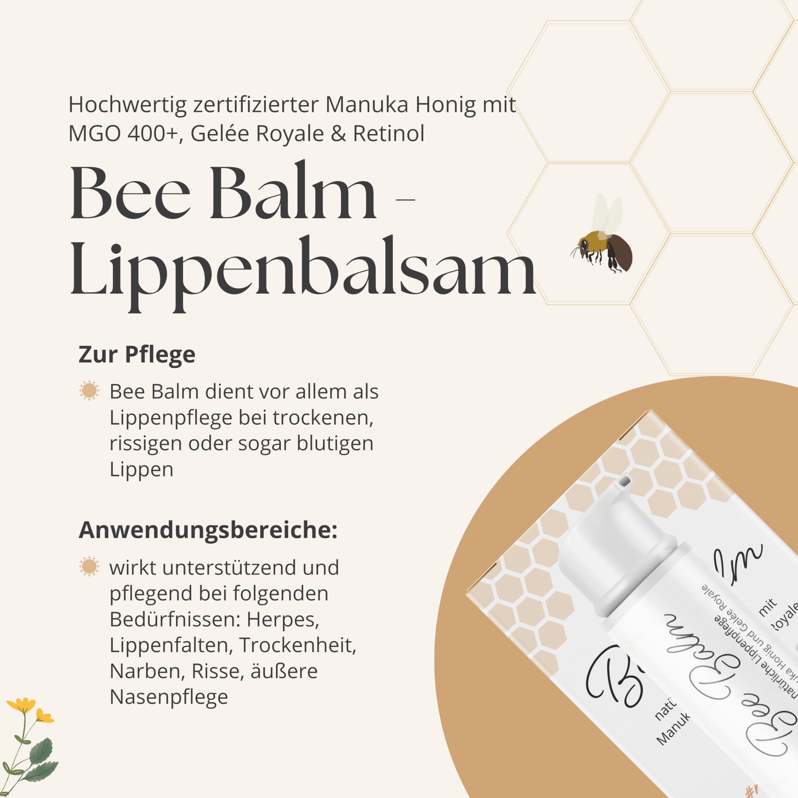 Der Bee Balm dient vor allem als Lippenpflege bei trockenen, rissigen oder sogar blutigen Lippen. Lippenbalsam kann aufgrund seiner Inhaltsstoffe auch bei folgenden Bedürfnissen unterstützend und pflegend eingesetzt werden: