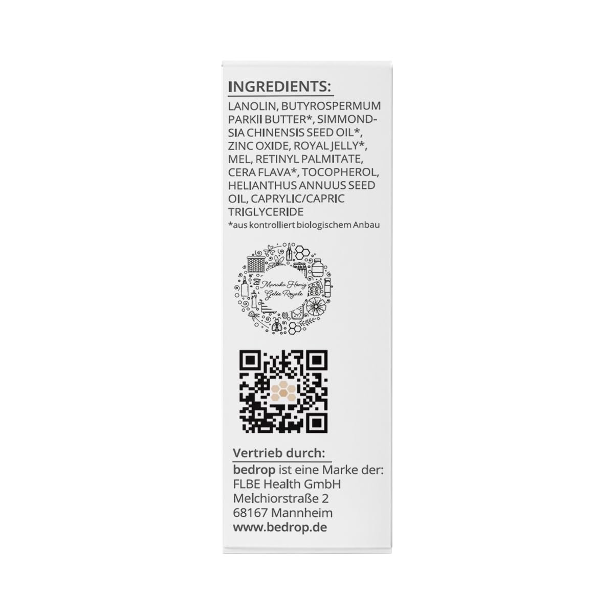 Königlicher Lippenpflegebalsam für samtig-weiche Lippen: Die Kombination aus Manuka Honig und Gelée Royale auf Basis von Bienen- und Wollwachs verleihen Deinen Lippen eine reichhaltige und feuchtigkeitsspendende Pflege. Verteile hierfür einen kleinen Pumpstoss auf Deinen trockenen, spröden oder glanzlosenLippen und geniesse das samtig-weiche Lippengefühl mit Bienenpower! Anwendungsbereiche Der Bee Balm dient vor allem als Lippenpflege bei trockenen, rissigen oder sogar blutigen Lippen. Lippenbalsam kann aufgrund seiner Inhaltsstoffe auch bei folgenden Bedürfnissen unterstützend und pflegend eingesetzt werden: - Herpes - Lippenfalten - Trockenheit - Feuchtigkeit - Narben - Risse - Nasenpflege - Winter & Sommer Retinol (auch: Vitamin A), Vitamin E und Zinkoxid besitzen in unserem Bee Balm eine besondere Rolle. Während Retinol dafür bekannt ist, dass es eine Anti-Falten Eigenschaft besitzt, wird Zinkoxid als natürlicher Schutz bei Sonneneinstrahlungen verwendet. Diese Eigenschaft kann vor allem im Sommer präventiv vor möglichen Falten schützen. Die natürlichen Inhaltsstoffe ermöglichen zudem eine alternative Anwendungsmöglichkeit bei der Nasenpflege (z.B. trockene Nasenflügel) oder dank des Zinkoxides bei Pickeln. Lippenpflege aus hochwertigen Bienenprodukten Ein natürlicher Lippenbalsam mit geballter Bienenpower versorgt Deine Lippen mit mehr Feuchtigkeit, pflegt und beugt zugleich Lippenfalten vor. Die Basis aus Sheabutter, Woll- und Bienenwachs bietet Deinem Lippenbalsam eine pflegende und geschmeidige Eigenschaft. Manuka Honig und Gelée Royale pflegen und schützen Deine Lippen das ganze Jahr, vor allem im Herbst und Winter gegen trockene und spröde Lippen. Die geschmeidige Konsistenz lässt den Balsam angenehm auf der Haut verteilen ohne dass ein spürbarer Fettfilm auf der Haut befindet. Wichtig im Winter & bei kalten Temperaturen: Vor dem ersten Gebrauch den Bee Balm in der Handinnenfläche erwärmen und mit mehrmaligem Anpumpen aktivieren.