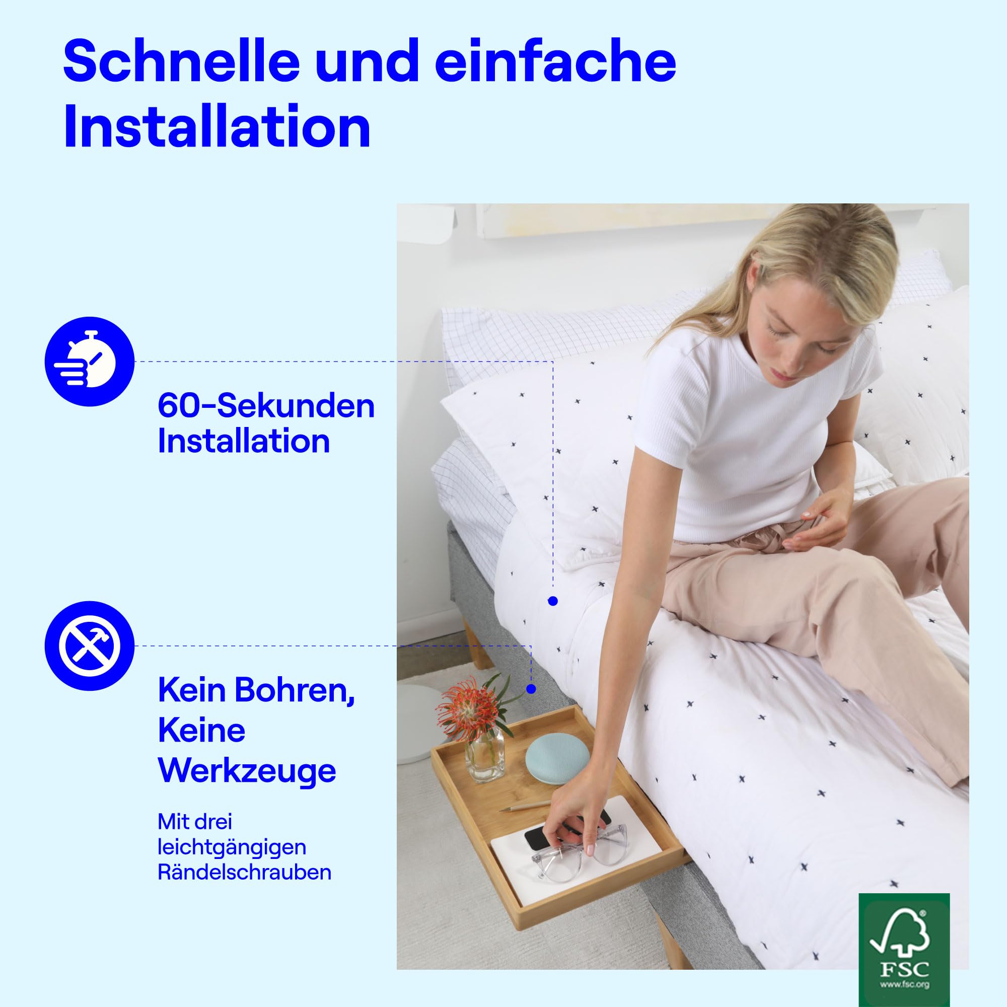 Treffen Sie Bedshelfie. Das BedShelfie Betttablett ist eine Neugestaltung des jahrhundertealten Nachttisches, inspiriert vom Small Space Living & Minimalism. Es ist konzipiert für: - Minimalisten befreien sich von sperrigen Möbeln (... beobachten Sie Tiny House Peeps) - Stadtbewohner beherrschen die schönen Künste des Stadtlebens in kleinen Räumen - Schüler stürzen sich in Zimmer im Sardinen-Stil auf der Suche nach einem Bettregal/Becherhalter/Kopfteil als Abschlussgeschenk oder Grundausstattung zum Schulanfang - Eltern, die wollen geben sie ihren kindern eine Zusätzlicher Platz durch die Verwendung des Etagenbettregals oder das Etagenbettregal. oder Etagenbettclip Designdetails auf dem Regal - Ein stromlinienförmiges und minimalistisches Designprofil für mehr Vielseitigkeit - Ein Metallschlitz zum einfachen Laden des Gerätes - Ein vielseitiges Klammerdesign, das in Bettrahmen mit einer Breite von bis zu 5,7 cm passt - Starke Haftung - Hält bis zu 15 Pfund - Eine dicke Filzpolsterung an den Kontaktpunkten der Klemme verhindert Kratzer - Oberfläche: 32,4 kg. x 21,8 x 7,6 cm Eine Kombination von Bewegungen für Arbeit und Lesen "Die Magie, die das Leben des Aufräumen verändert", inspirierte uns, uns endlich von unseren lästigen Möbeln zu befreien, indem wir dort beginnen, wo wir sauer sind und unseren Tag - das Schlafzimmer - das Schlafzimmer - beendet. Wir haben Interwebs auf der Suche nach platzsparenden Nachttischen getroffen und kleine Nachttische aller Art gefunden. Schwimmende Nachttische, schmale und dünne Nachttische, aber wir wollten Menschen wie uns dienen, die nicht in etwas Unbeholfenes investieren wollten, das uns belasten würde, um die Welt zu sehen. Eine nachhaltige Zukunft – eine nachhaltige Zukunft aufzubauen ist für uns absolut wichtig. Wir sind stolz darauf, die Bambus BedShelfie in Handarbeit herzustellen, auch wenn Bambus technisch gesehen ist