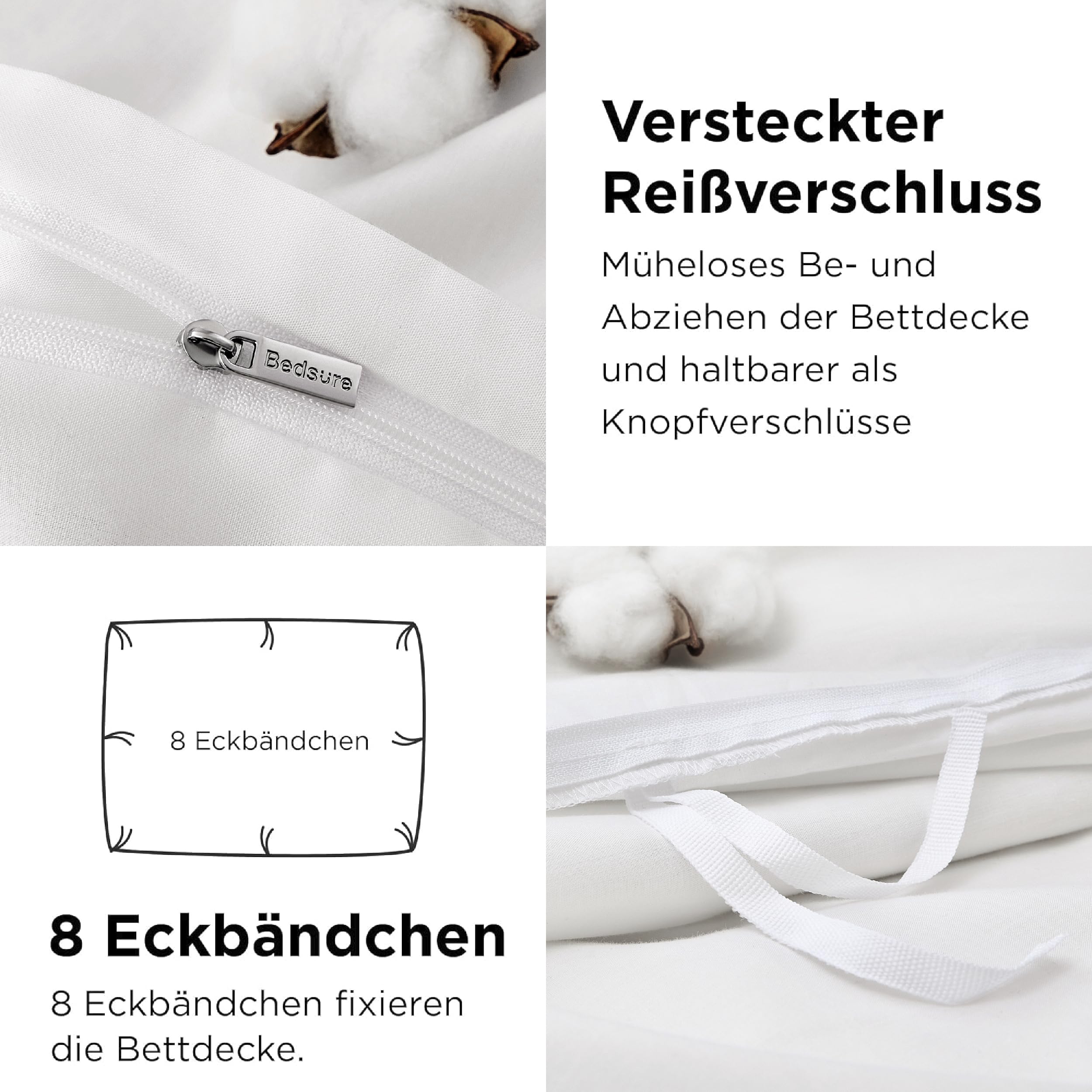 BEDSURE Bettwäsche 220x240 Baumwolle Weiss - Bettwäsche-Sets 220 x 240 cm Bettbezug 3teilig mit 2 Kissenbezüge 80x80 cm, Oeko-TEX Bedding mit Reissverschluss