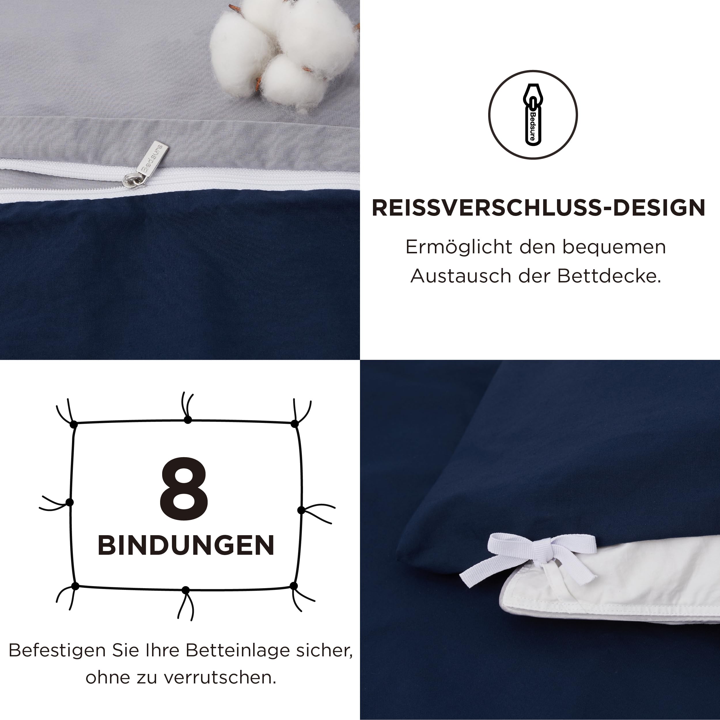BEDSURE Bettwäsche 155x220 Blau Grau - Baumwolle Bettwäsche-Sets 155 x 220 cm Wendebettwäsche 3teilig mit 2 Kissenbezüge 80x80 cm, Oeko-TEX Zweifarbiger Bettbezug mit Reissverschluss