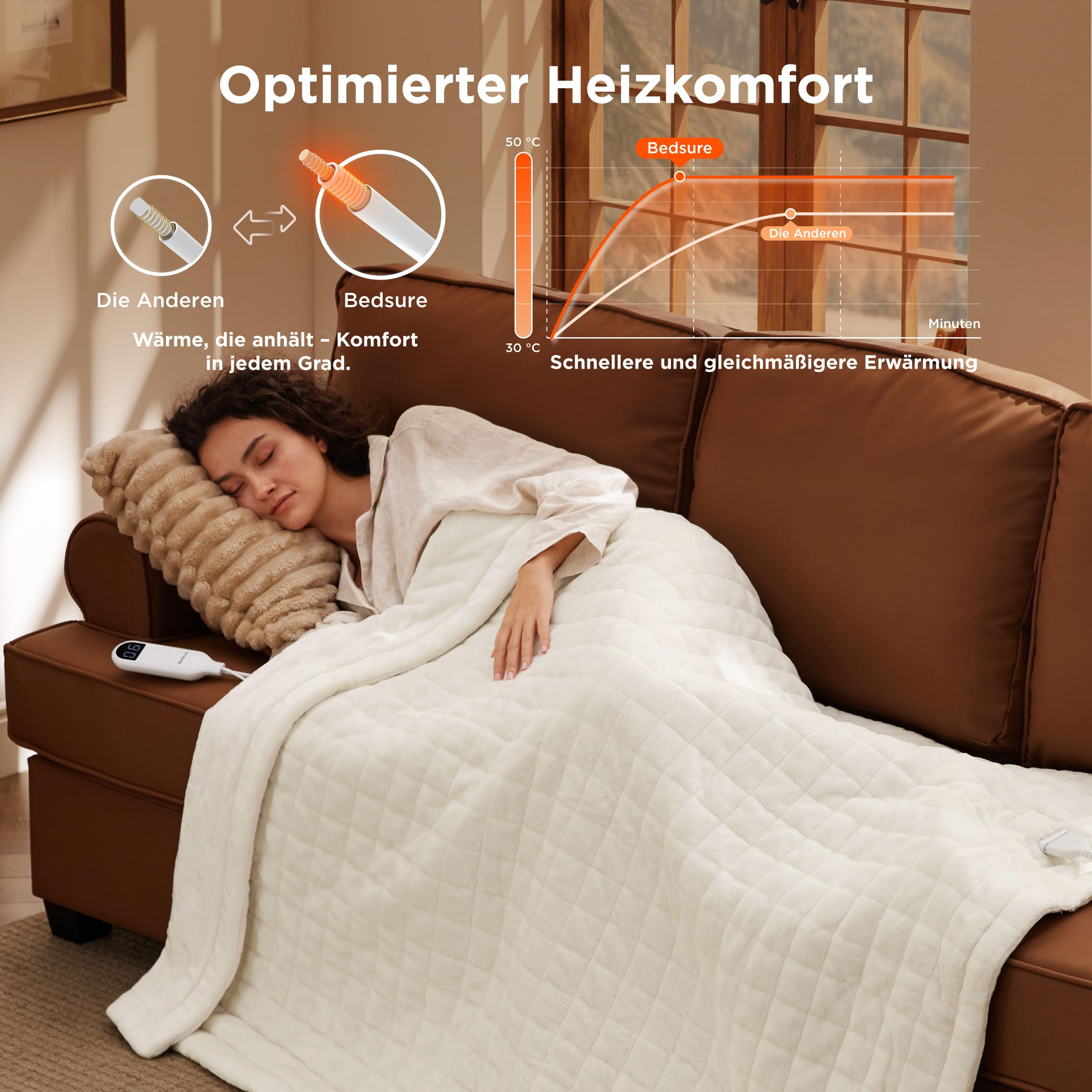 - Sicher und zuverlässig: Wenn kein Timer eingestellt ist, schaltet sich die Heizdecke nach 8 Stunden automatisch ab, um Überhitzung zu vermeiden. Sie hat 74 Sicherheitstests bestanden, die im Bedsure Intertek-anerkannten Satelliten-Labor durchgeführt wurden und die UL-Standards übertreffen. Wir setzen alles daran, Ihnen ein noch sichereres Produkt zu bieten.