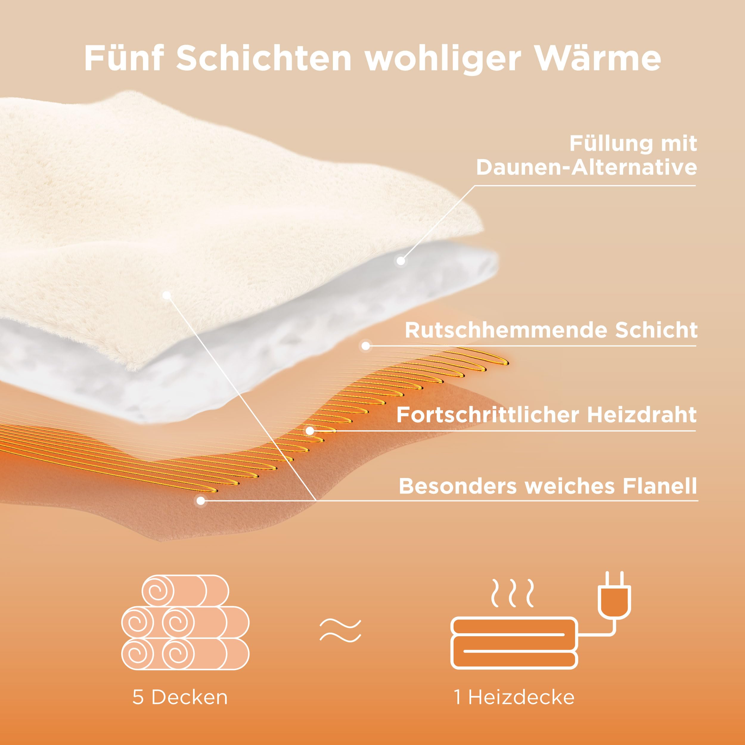 - Anpassbare Wärme: Diese Heizdecke mit Abschaltautomatik bietet schnelle und konstante Erwärmung mit 6 Heizstufen und 10 Zeiteinstellungen für individuell anpassbare Gemütlichkeit, damit Sie Ihre gewünschte Wärme erhalten. Angetrieben von fortschrittlicher Heizdrahttechnologie sorgt sie für präzise Temperaturkontrolle und sichere Wärme.