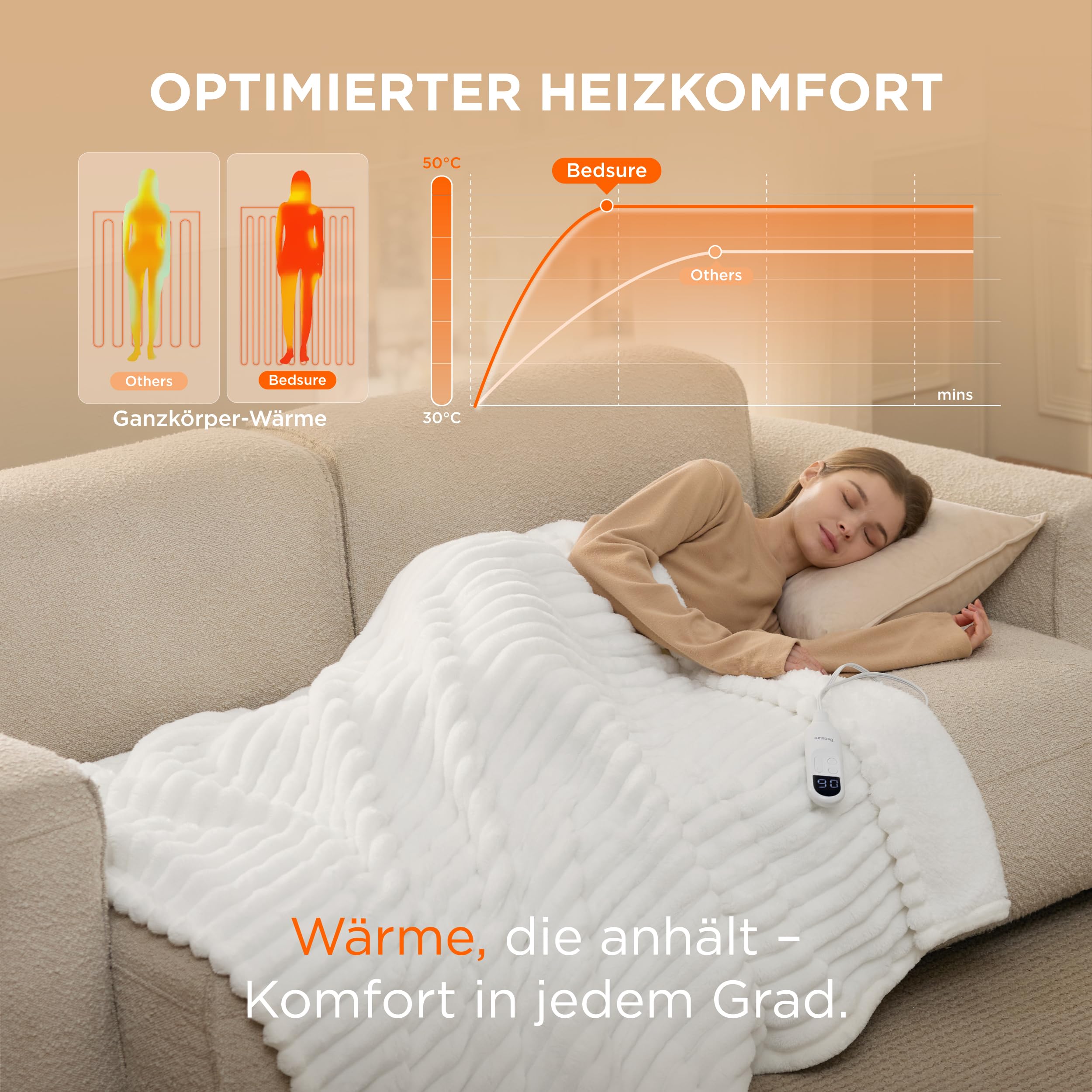 - Sicher und zuverlässig: Wenn kein Timer eingestellt ist, schaltet sich die Heizdecke nach 8 Stunden automatisch ab, um Überhitzung zu vermeiden. Sie hat 74 Sicherheitstests bestanden, die im Bedsure Intertek-anerkannten Satelliten-Labor durchgeführt wurden und die UL-Standards übertreffen. Wir setzen alles daran, Ihnen ein noch sichereres Produkt zu bieten.