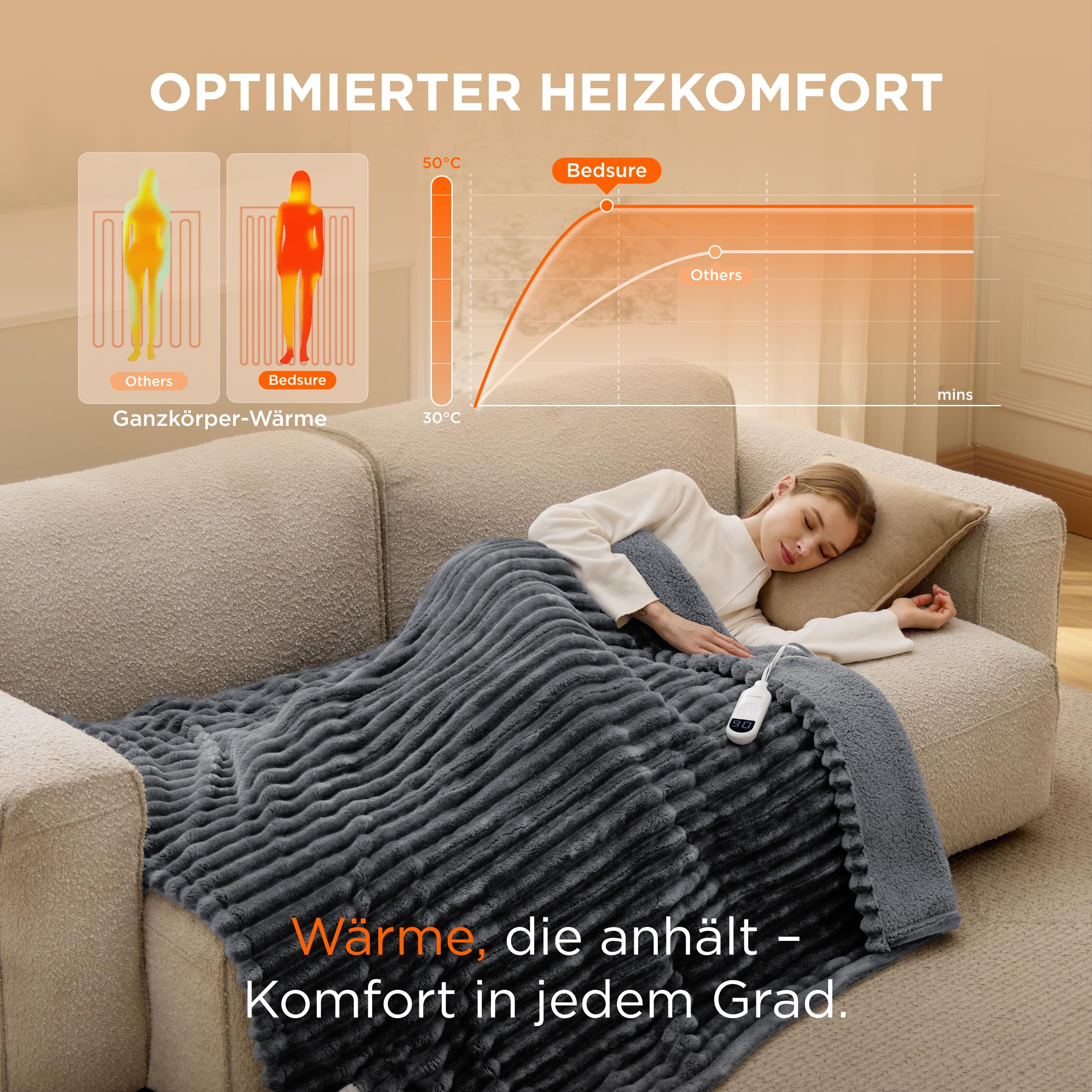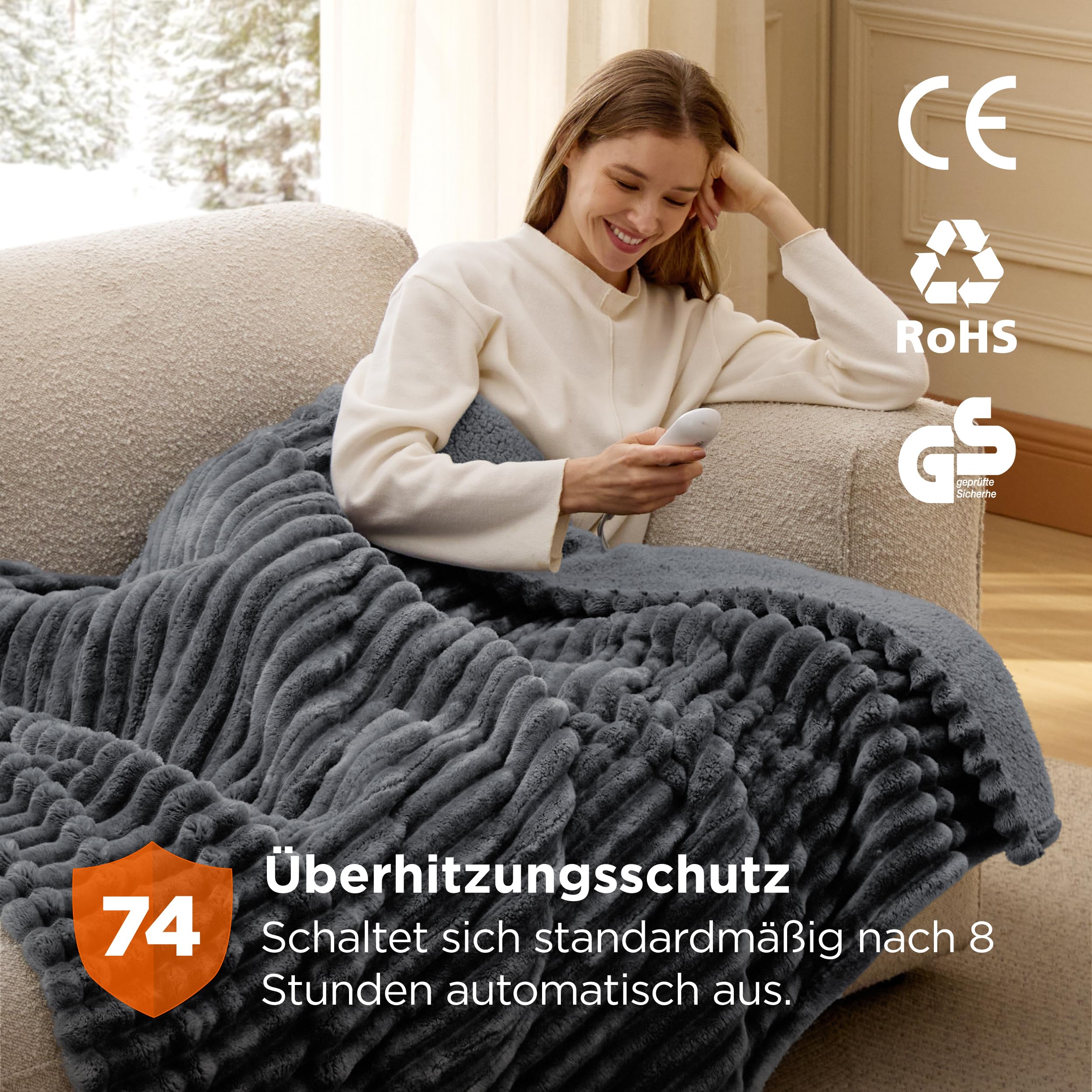 - Sicher und zuverlässig: Wenn kein Timer eingestellt ist, schaltet sich die Heizdecke nach 8 Stunden automatisch ab, um Überhitzung zu vermeiden. Sie hat 74 Sicherheitstests bestanden, die im Bedsure Intertek-anerkannten Satelliten-Labor durchgeführt wurden und die UL-Standards übertreffen. Wir setzen alles daran, Ihnen ein noch sichereres Produkt zu bieten.