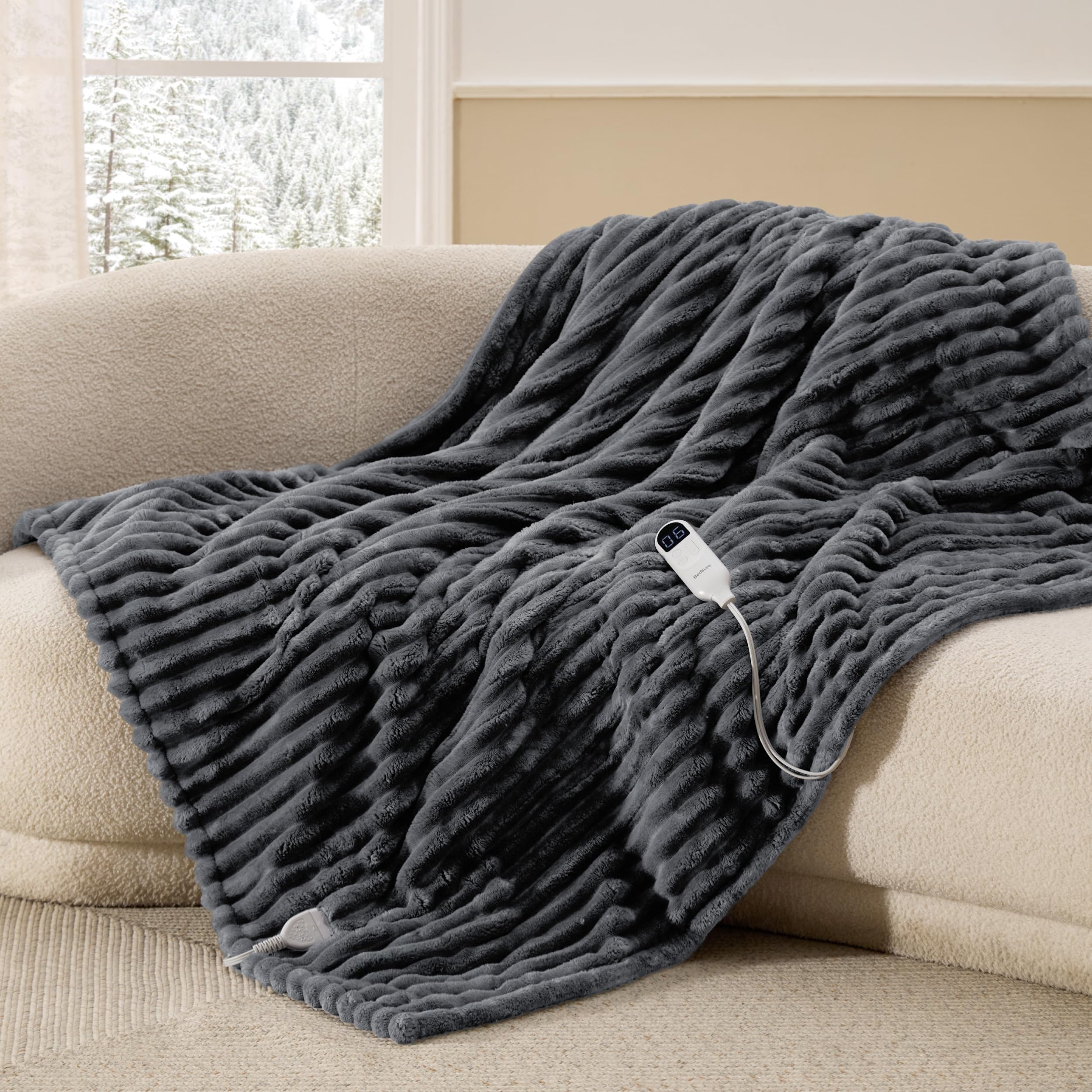 BEDSURE Heizdecke mit Abschaltautomatik 130x180cm - Geschenke für Frauen, Wärmedecke mit 6 Heizstufen & 10 Stunden Timer, bis zu 8 Stunden Überhitzungsschutz für Home & Office, Gestreift Dunkegrau