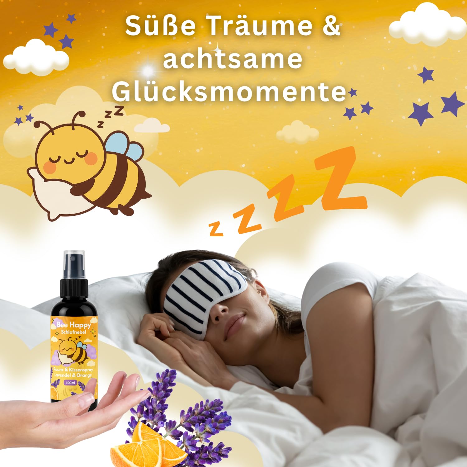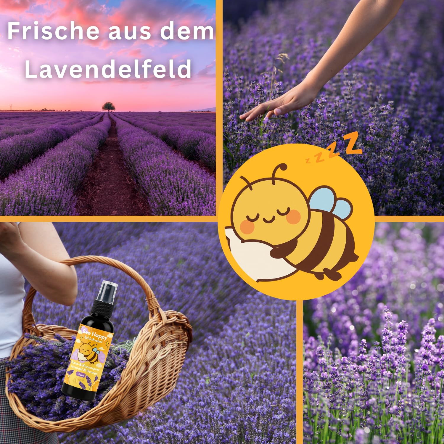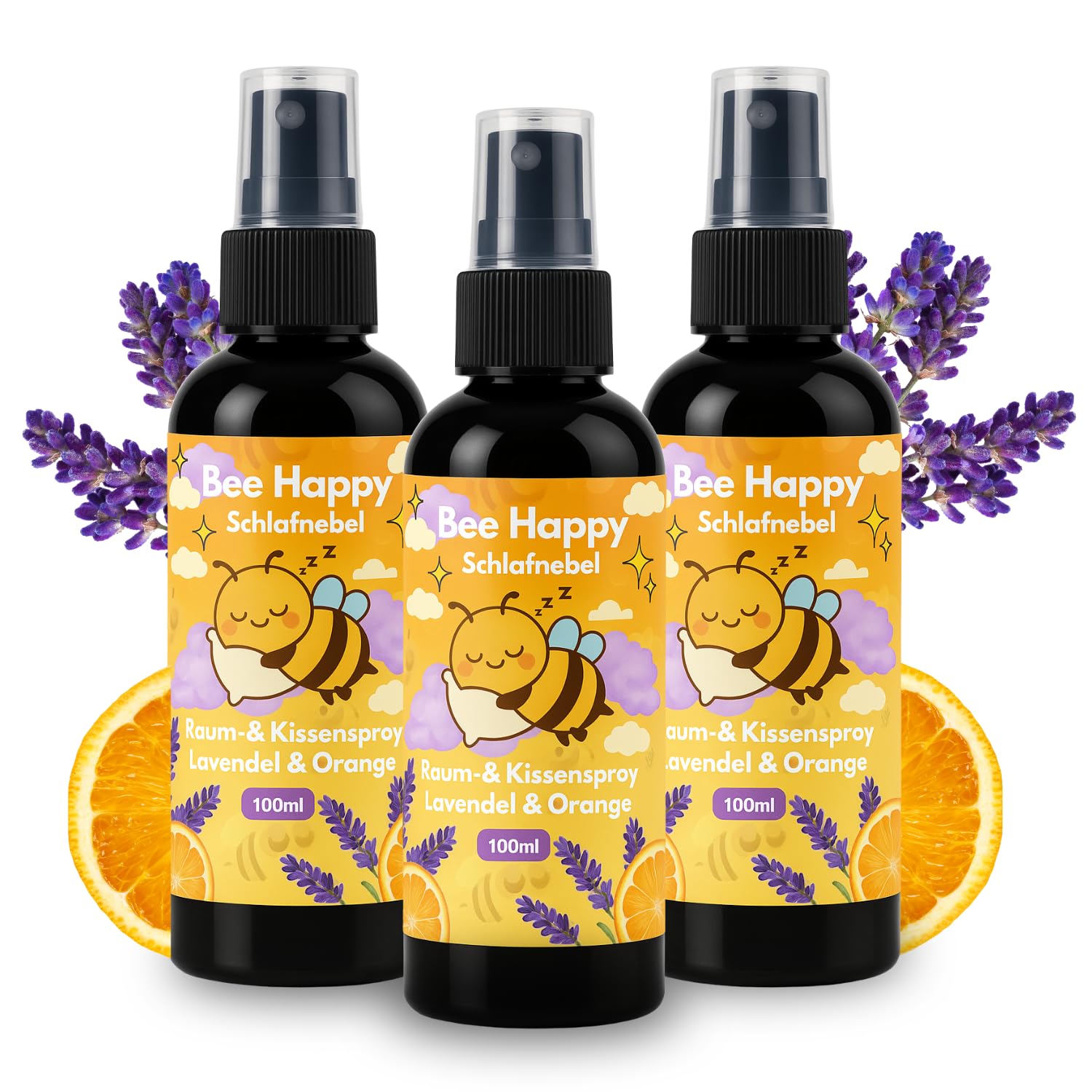 Bee Happy Kissenspray Set 3x100ml – Bio Lavendel-Orangen mit ätherischen Ölen – Frischer Duft für Kissen, Bett & Schrank – Ideal für Yoga, Entspannung, Konzentration & als Raumspray