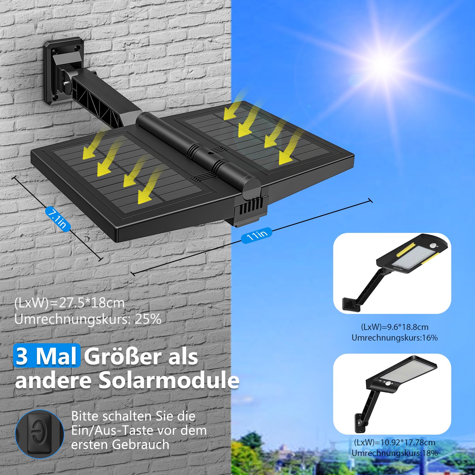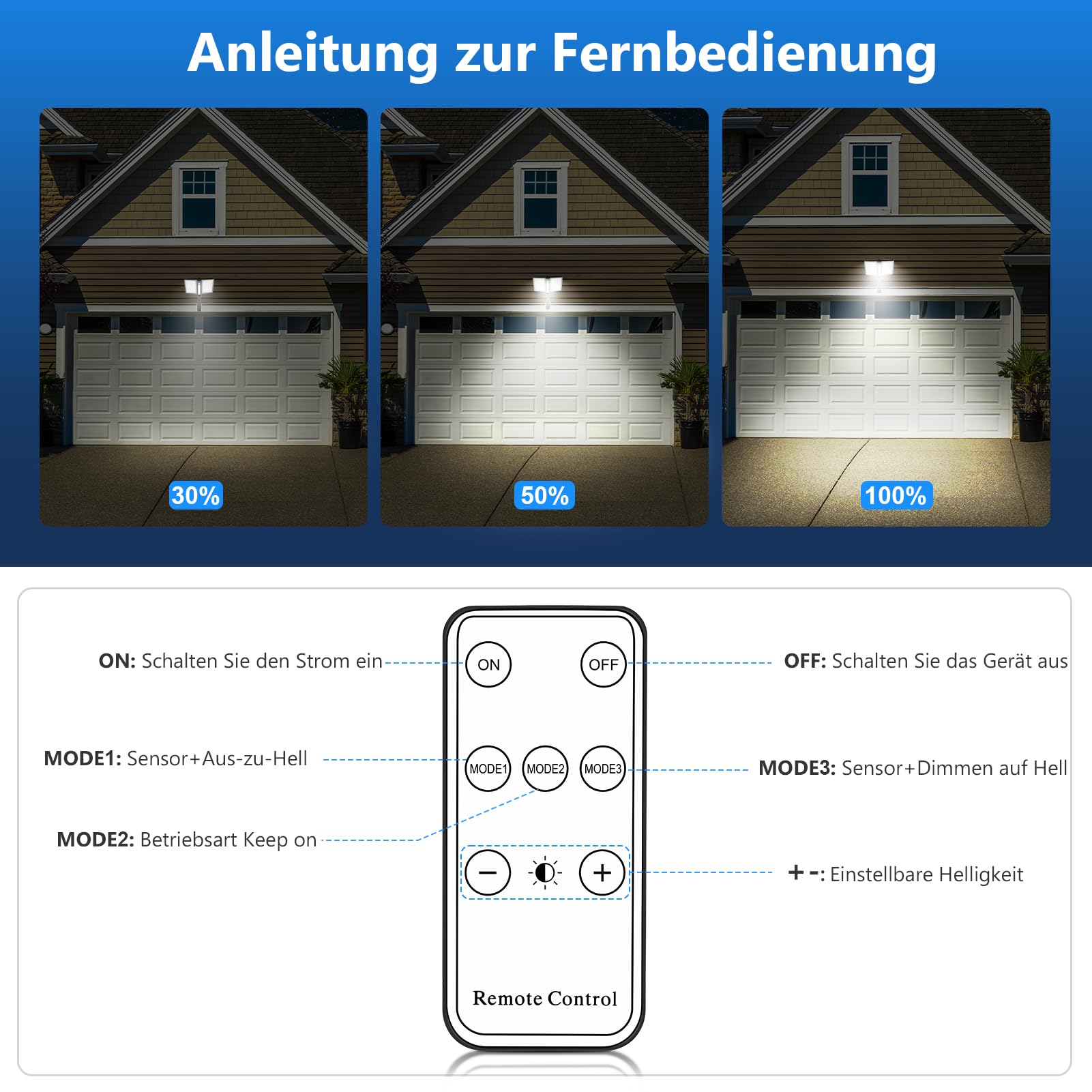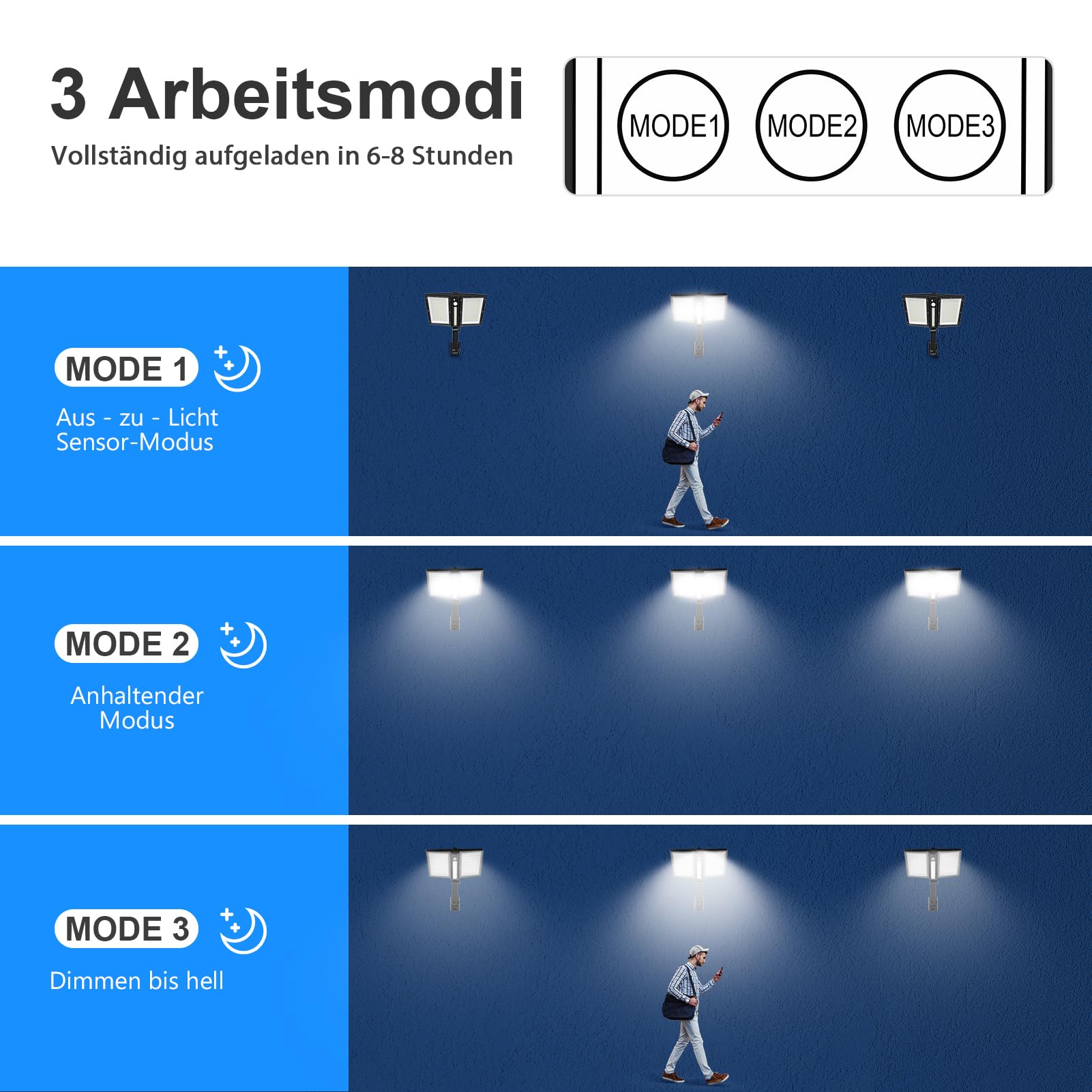 Beschreibung des Produkts:※ Hinweis: Bitte laden Sie das Licht mindestens 8 Stunden vor dem ersten Gebrauch auf.Produkt Eigenschaften:◆ LED: 3.5W 180pcs LED.◆ Winkel der Lichtperlen: 210° ◆ Beleuchtungsreichweite: bis zu 82.5 sq. ft◆ Lumen: 1200lm±10%◆ Material: ABS + PC◆ Sonnenkollektor: 3W 5.5V x 2pcs polykristallines Silizium.◆ Solarmodul Grösse: 14.5 inX11.0 inX6.9 in◆ Sonnenkollektor einstellbarer Winkel: 180° ◆ Wasserdichte Bewertung: ip65◆ Widersteht Temperatur: +13°F bis -113F°◆ Batterie: 3.7V 3600mAh Lithium-Ionen-Akku.◆ Aufladezeit: 6-8H◆ Betriebszeit: 8-10 Stunden◆ Erfassungsbereich des PIR-Sensors: 1-5M ◆ Erfassungswinkel des PIR-Sensors: 120° ◆ Lichtsensor: 20LUX◆ Farbtemperatur: Kaltweiss 6500K◆ Funktion: Mit drahtloser FernsteuerungFunktionen der Fernbedienung:▶ Funktion 1: 100% Licht an in der Nacht, wenn Leute kommen, Licht aus nach 30s, wenn Leute gehen.▶ Funktion 2: 10% immer an in der Nacht, aus am Tag▶ Funktion 3: Halten Sie 5% leicht hell, Menschen kommen zu 100% Licht, Menschen gehen weg nach 30s 5% leicht hellPaket enthält:☑ 1*Lichtkörper☑ 1*Fernbedienung☑ 1*Bedienungsanleitung☑ 1*Installationspaket