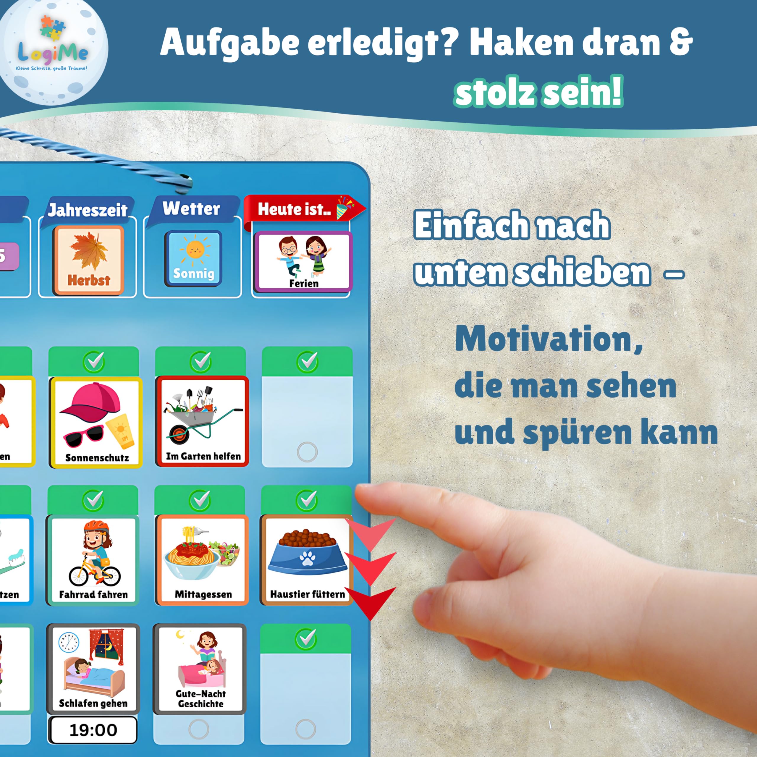 Basierend auf unseren eigenen Erfahrungen als Eltern und in enger Zusammenarbeit mit Pädagogen haben wir eine spielerische, visuelle und praktische Lösung entwickelt. Sie hilft deinem Kind, den Tag selbstständig zu meistern – vom Zähneputzen am Morgen bis zum Schlafanzug am Abend. Ganz ohne Druck – dafür mit Motivation, Orientierung und jeder Menge Stolz!