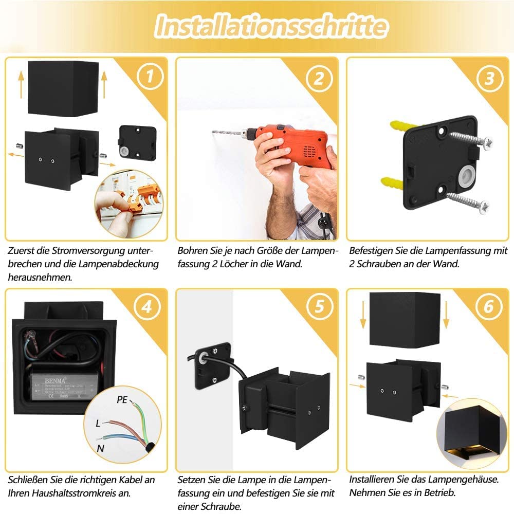 Installationszeichnungen sind enthalten, sie führen Sie zur Installation der Wandleuchte.