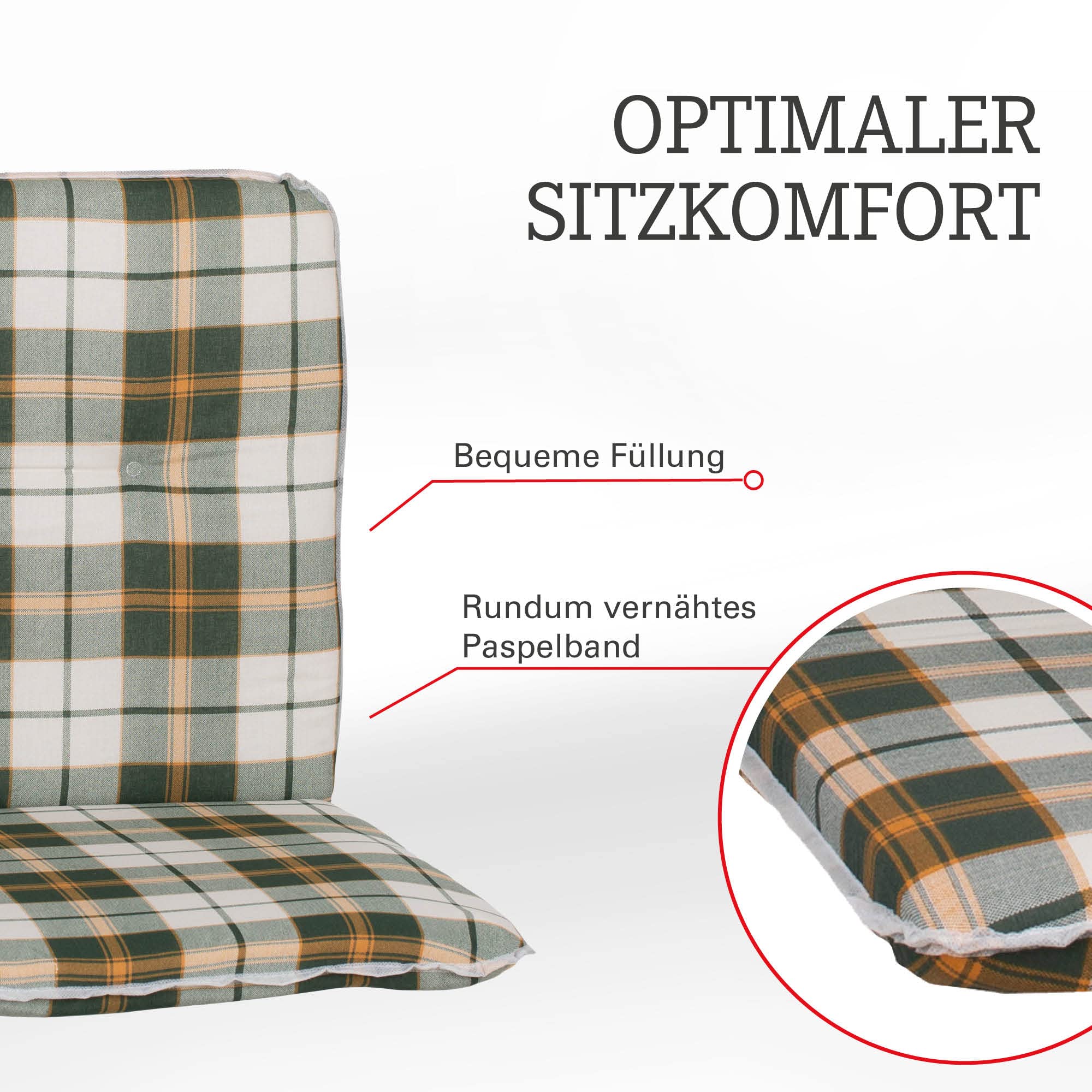 Beo Niedriglehner Auflagen Waschbar Bali | Made in EU nach Öko-Tex Standard | Atmungsaktive Stuhlauflage Niedriglehner mit Halteband | UV-beständige Auflagen Niedriglehner in Beige-Grün Kariert, 23786