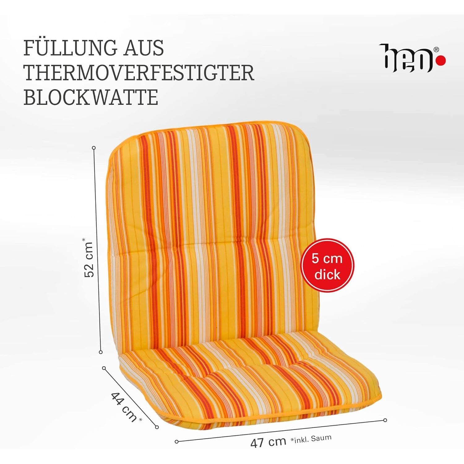 Beo Bali Gartenstuhl-Auflagen Niedriglehner 96x47 cm, 4er Set orange gelb weiss gestreift | Waschbare, UV-beständige Sitz-Kissen | Atmungsaktive Polster-Auflagen nach Öko-Tex Standard | Made in EU
