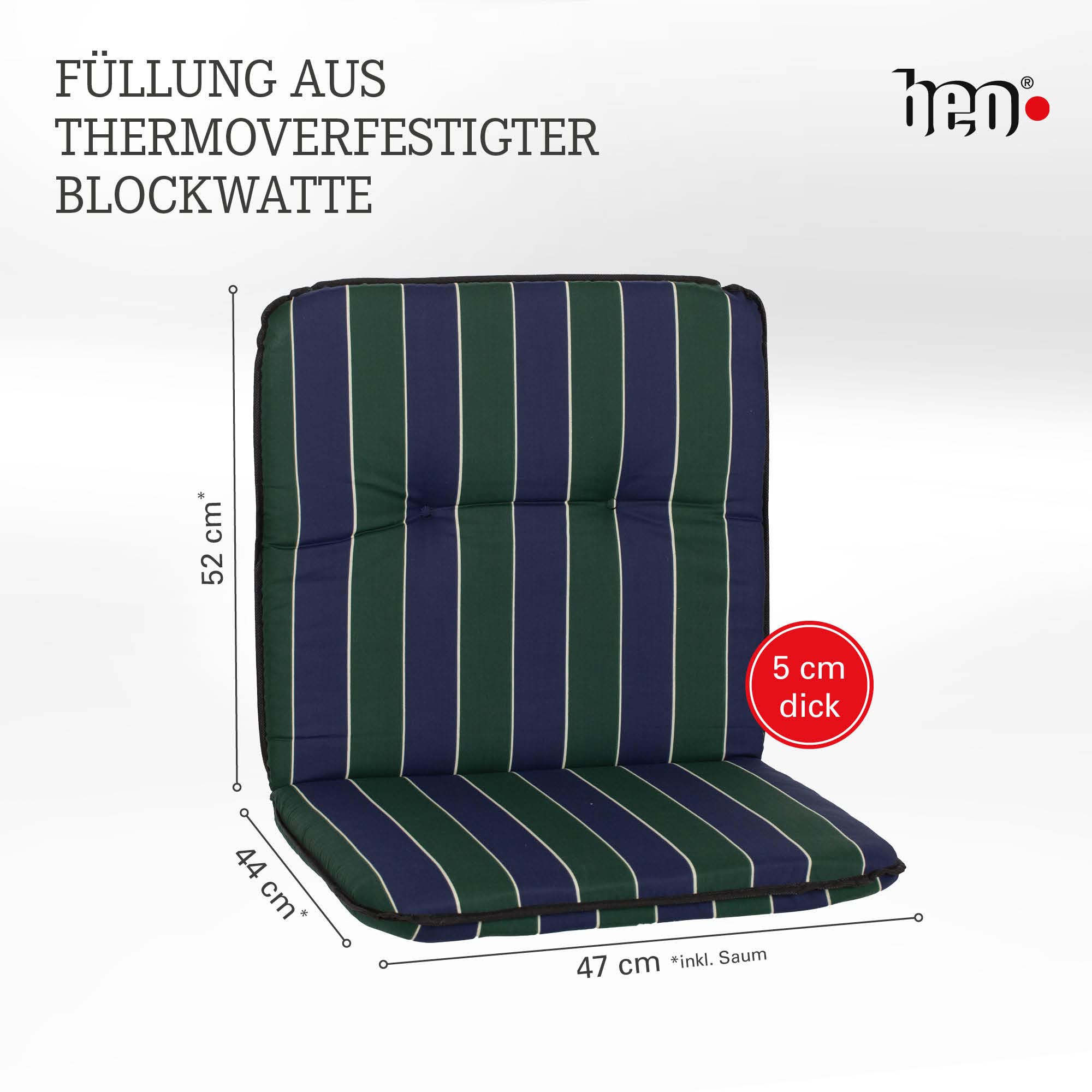 Beo Niedriglehner Auflagen Waschbar Bali | Made in EU nach Öko-Tex Standard | Atmungsaktive Stuhlauflage Niedriglehner mit Halteband | UV-beständige Auflagen Niedriglehner mit Streifen in Blau-Grün