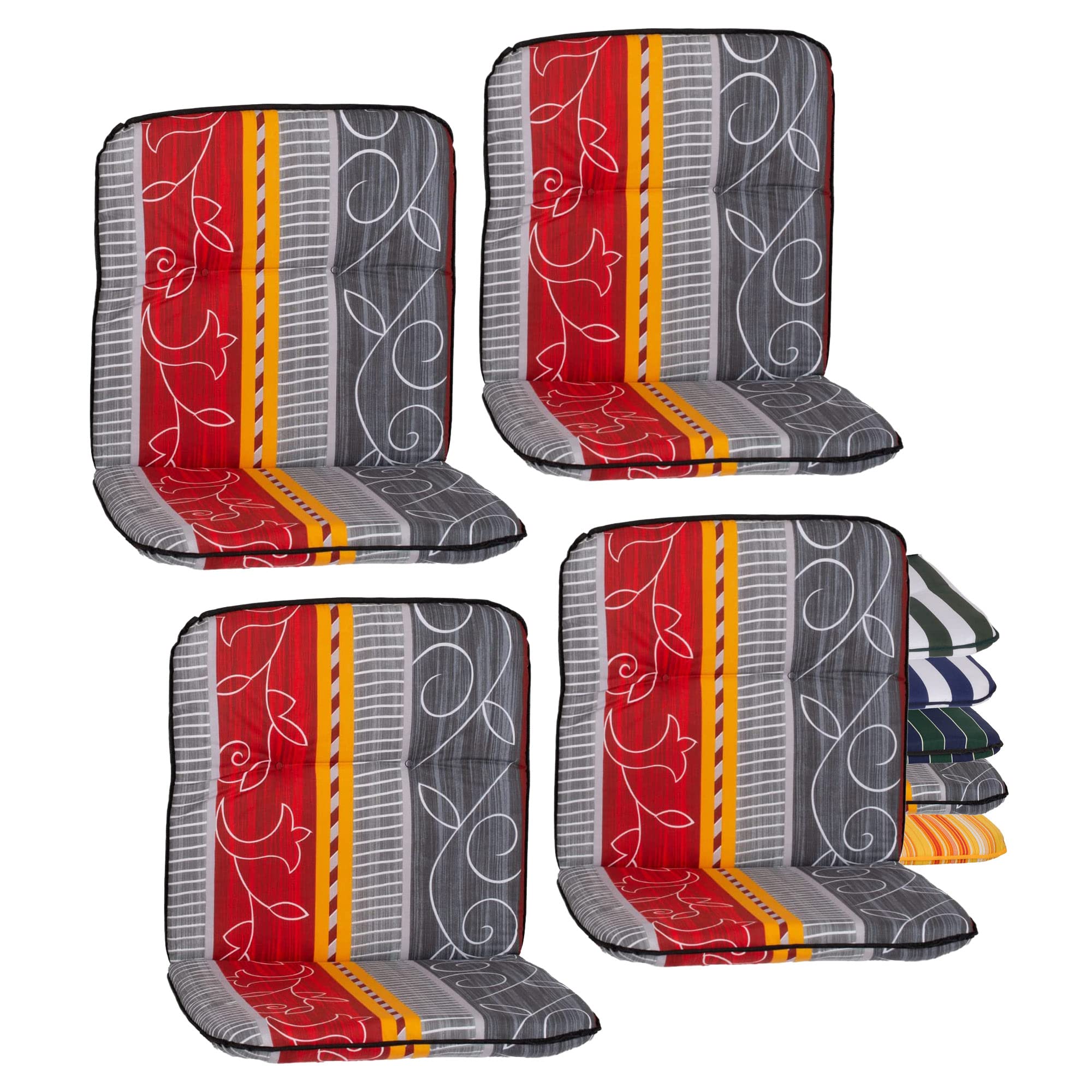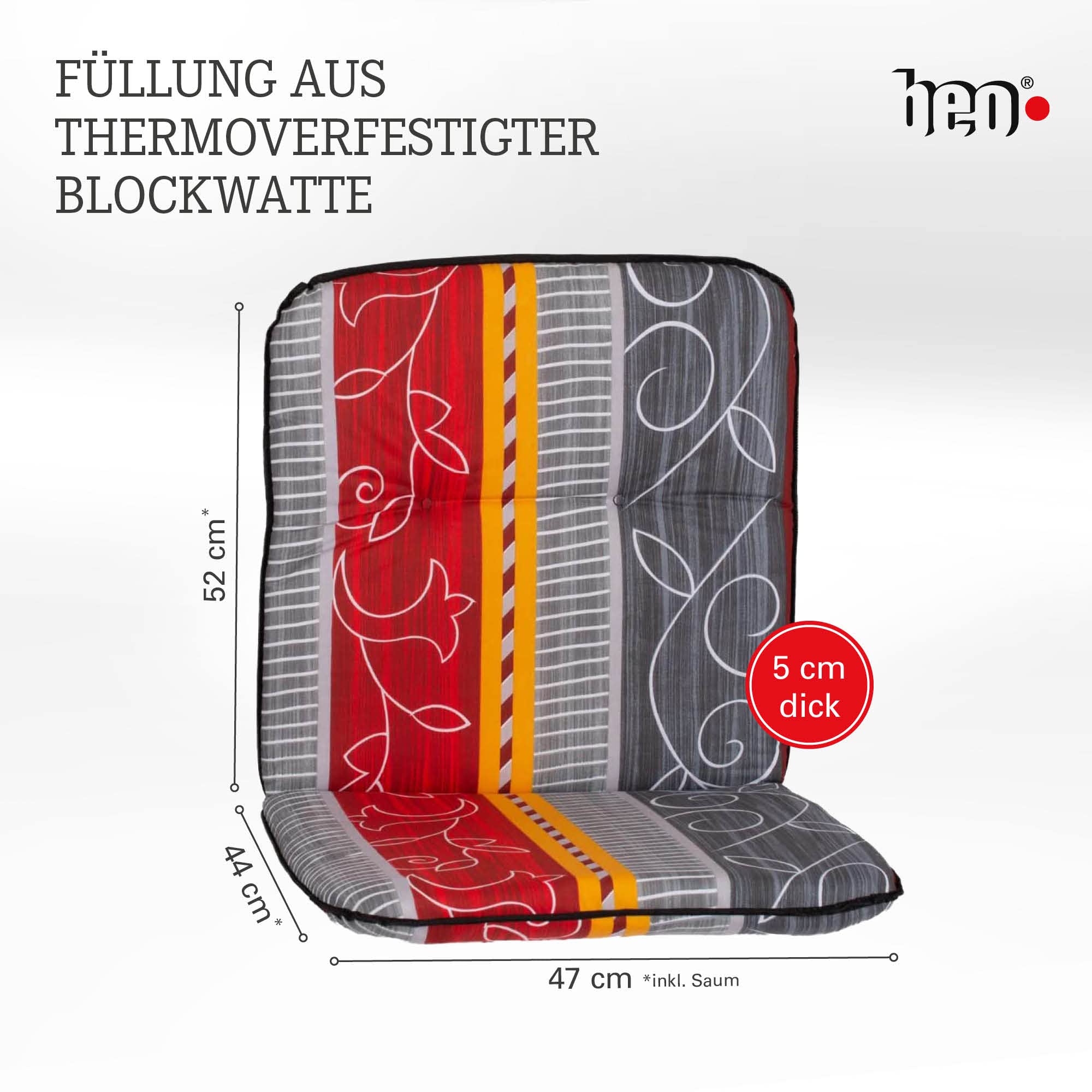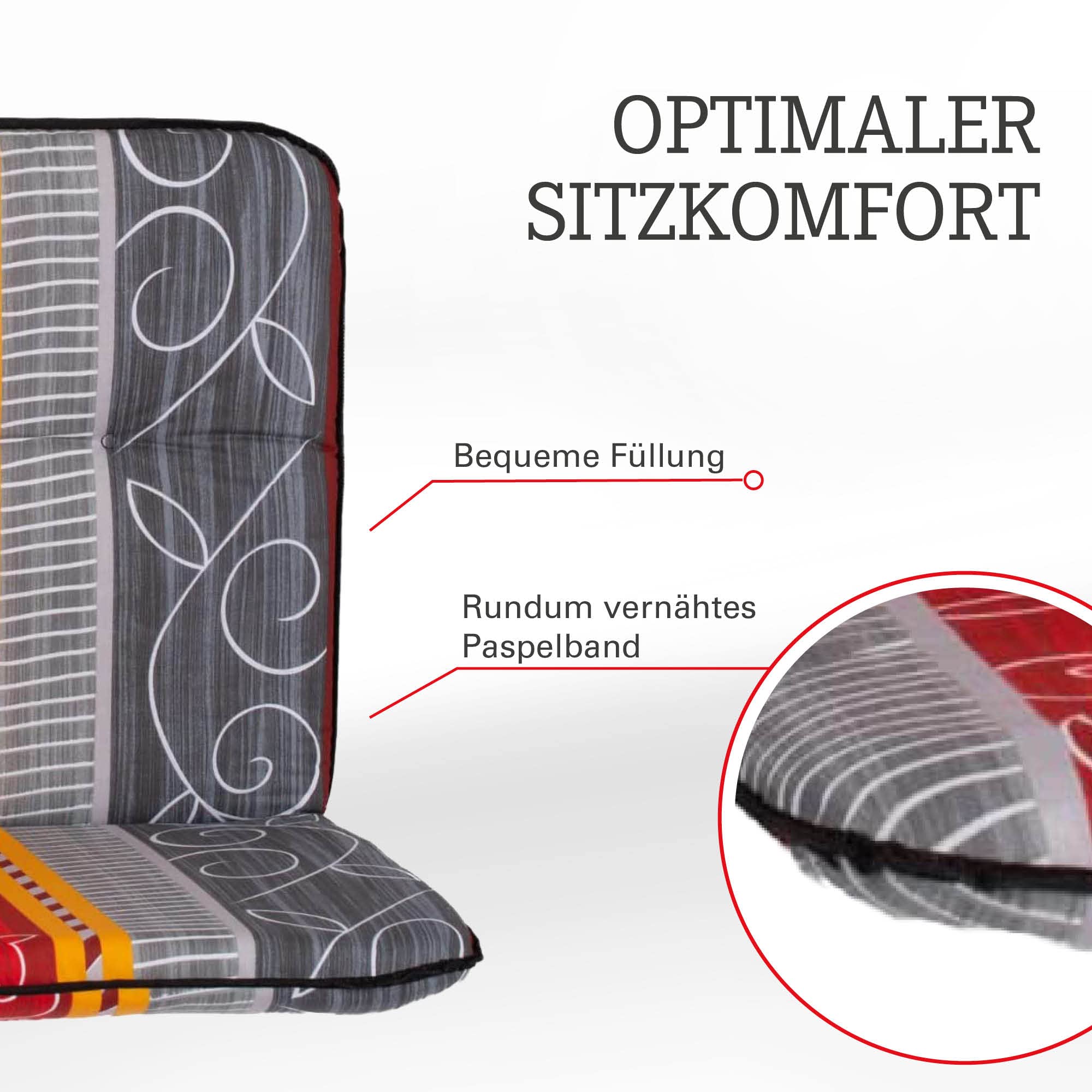 Beo Niedriglehner Auflagen 4er Set waschbar Bali | Made in EU | Atmungsaktive Garten-Stuhlauflage Niedriglehner mit Halteband | UV-beständige Auflage für Gartenstühle mit Ornamenten in Rot-Grau