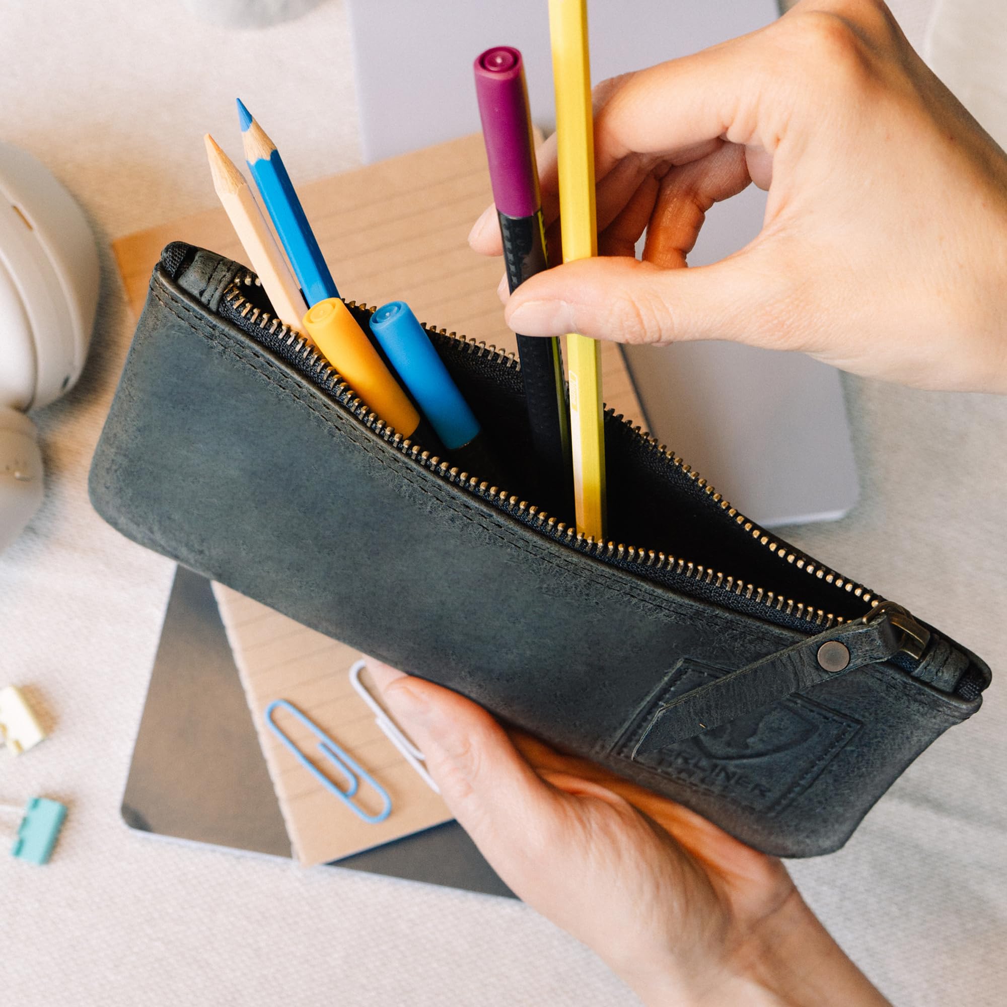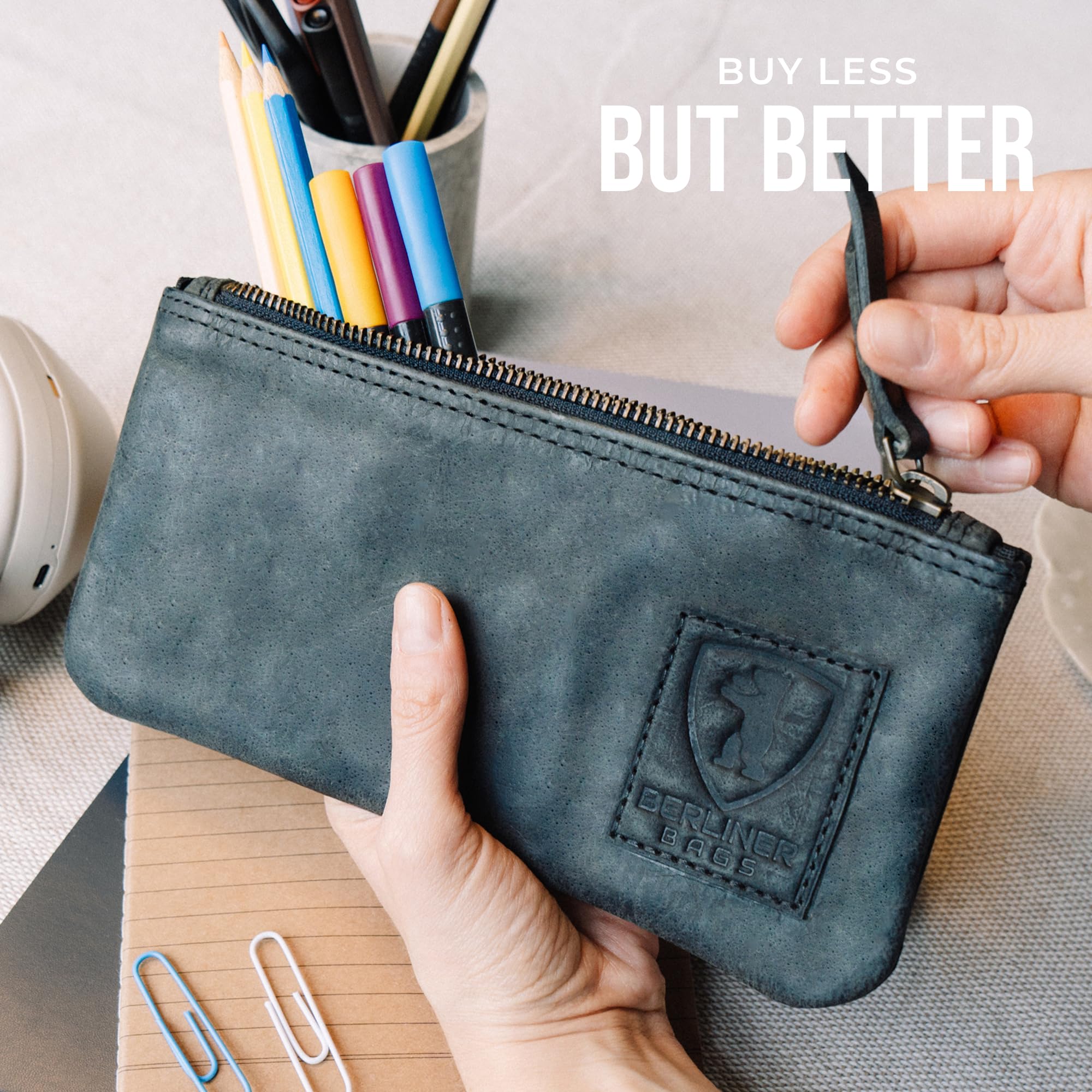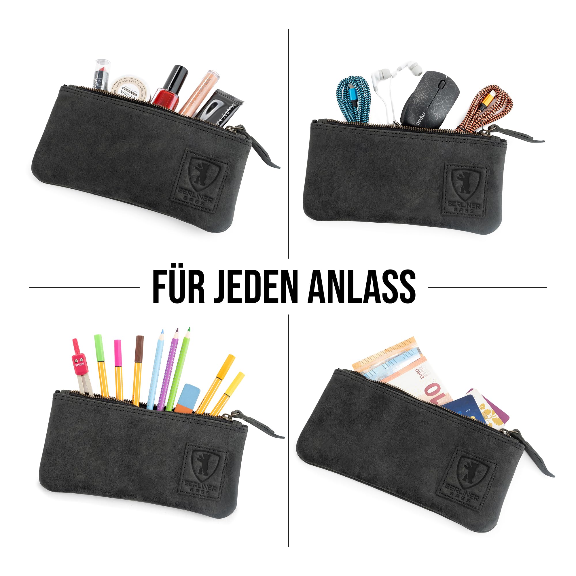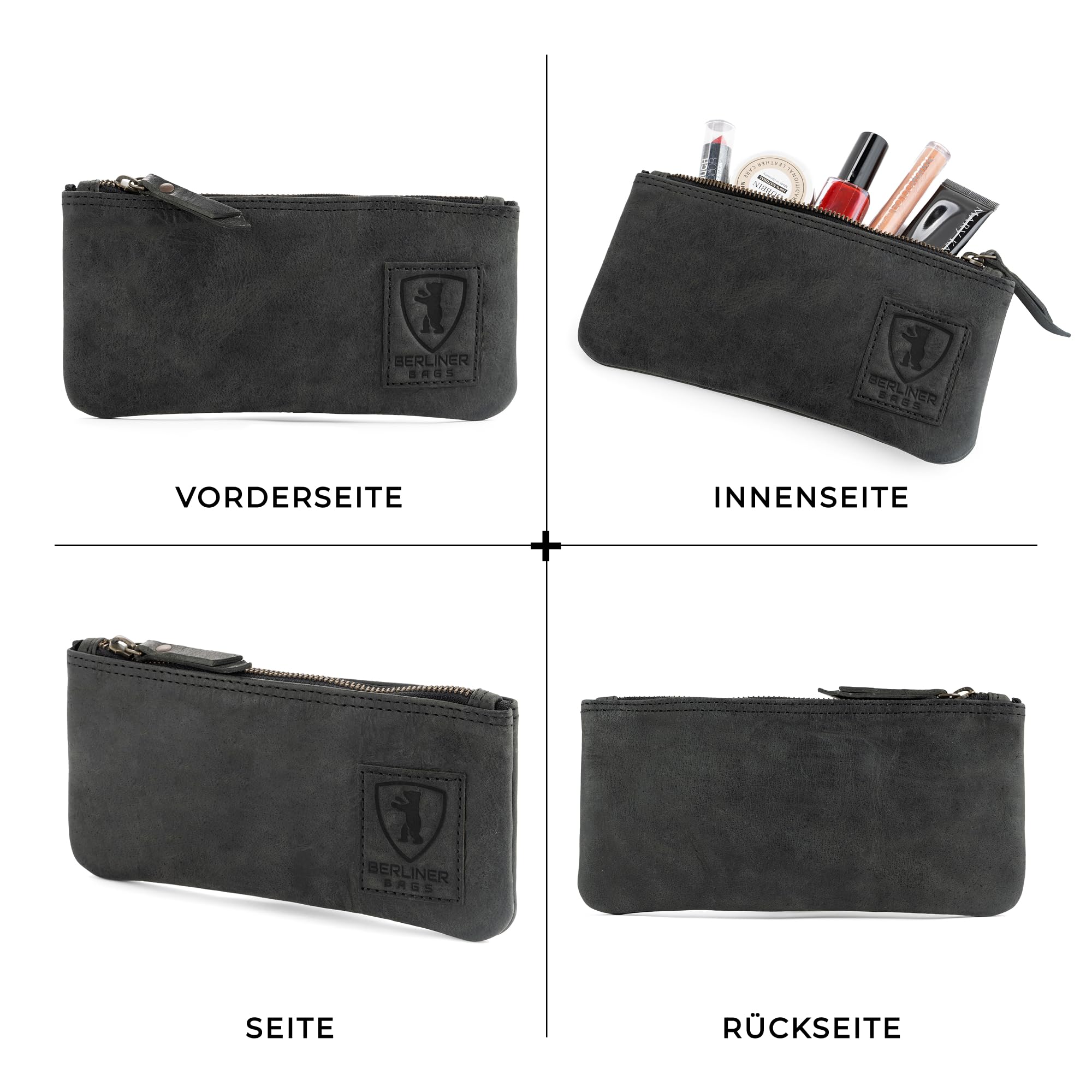 Berliner Bags Vintage Federmäppchen Etui aus Leder mit YKK-Reissverschluss, Robuste Federmappe für Stifte und Zubehör - Dunkelgrau