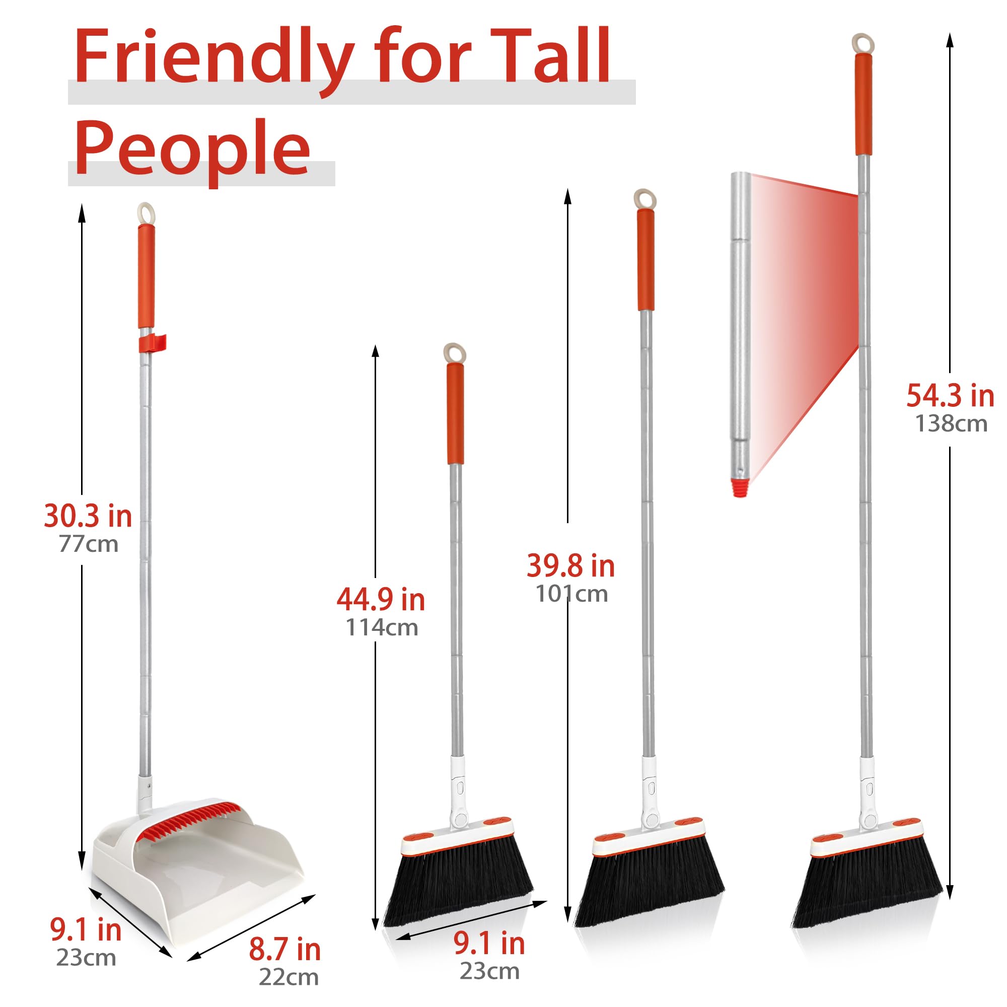 JEHONN Besen und Kehrschaufelset Set mit Langem Griff, 180 Grad Drehbar Kehrmaschine und Kehrschaufel Combo für Haus, Büro, Lobbykehr (Grau/Rot)