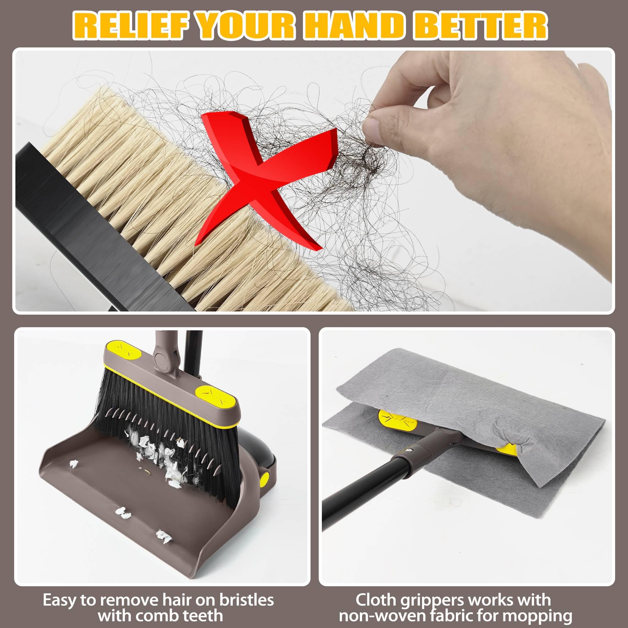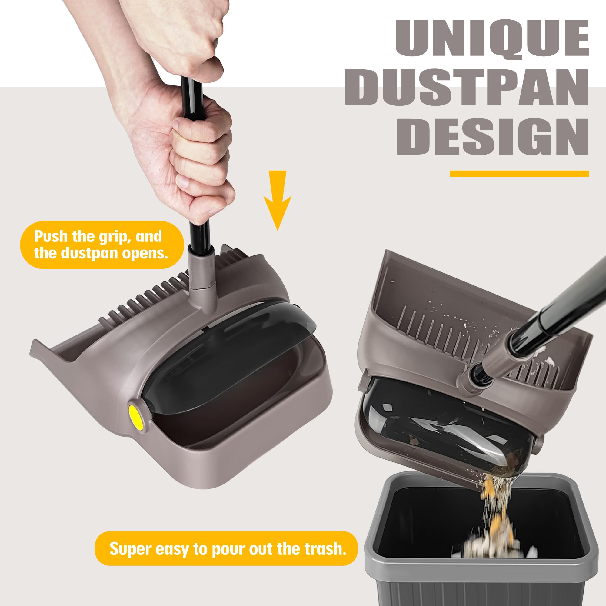 JEHONN Besen und Kehrschaufel Set mit Langem Stiel 138CM, 180 Grad Drehen Kehrbesen, Öffnende Schaufel Schwanz, Broom and Dustpan für Haus, Büro, Lobbykehr (Braun Gelb)