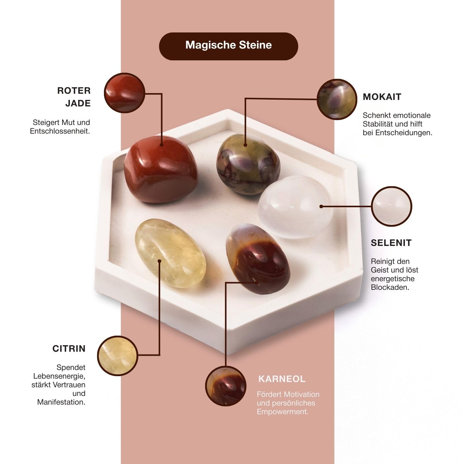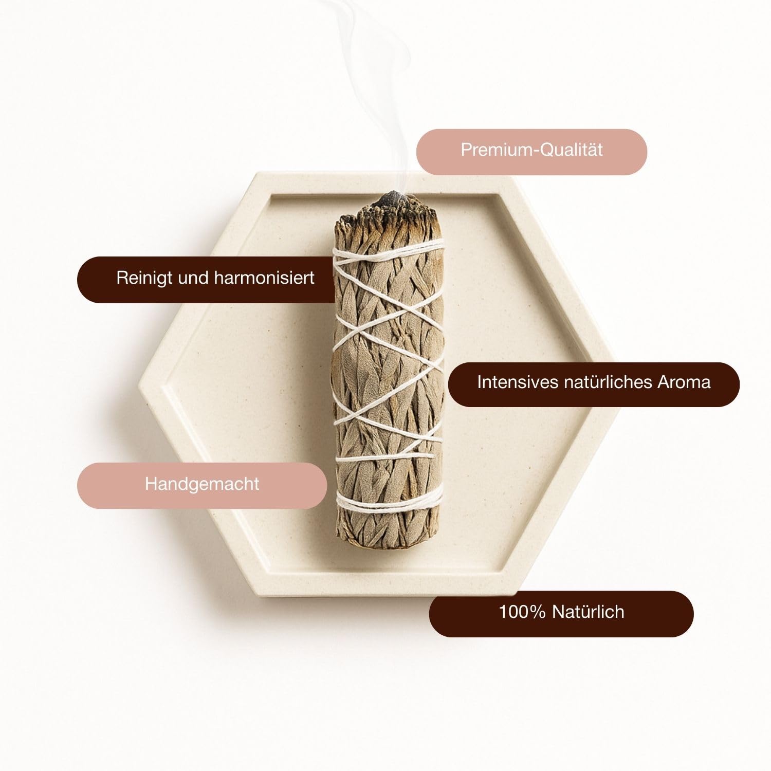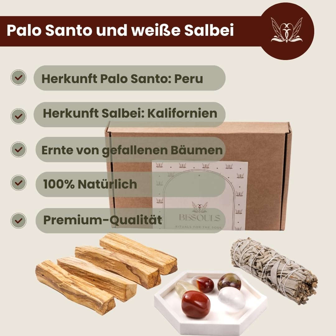 BESOULS Premium Räucherset Kraft: Entfessele deine innere Stärke Erwecke deine innere Kraft mit dem BESOULS Premium Räucherset Kraft, perfekt gestaltet, um negative Energien zu vertreiben und deine innere Stärke zu aktivieren. Dieses Set enthält 4-6 Palo Santo Räucherholz, 1 Weisser Salbei zum Räuchern, 5 kraftvolle Steine für innere Stärke und ein handgemachtes Tablett. Perfekt für spirituelle Rituale und Meditation. Palo Santo und Weisser Salbei für Klarheit und Kraft Unsere Palo Santo Holz-Sticks und der weisse Salbei sind kraftvolle Werkzeuge, die negative Energien vertreiben und eine Atmosphäre von innerer Stärke und Gelassenheit schaffen. Verwende sie in deinen täglichen Meditationen oder spirituellen Ritualen, um dich zu zentrieren und dein energetisches Gleichgewicht zu stärken. 5 Steine für innere Kraft Das Set enthält 5 kraftvolle Steine, die dir helfen, deine innere Stärke zu entfesseln und dein Gleichgewicht zu finden: Roter Jade: Stärkt den Mut und die Entschlossenheit. Selenit: Bringt Klarheit und reinigt energetische Blockaden. Citrin: Fördert Selbstvertrauen und Fülle. Karneol (Cornalina): Steigert Kreativität und Motivation. Mokait: Unterstützt emotionale Stabilität und innere Ruhe. Handgemachtes Tablett als spiritueller Altar Das handgemachte Tablett dient als idealer Altar für deine Steine und Räucherutensilien. Es bringt nicht nur Funktionalität, sondern auch eine energetische und ästhetische Komponente in dein Zuhause. Perfekt für die Präsentation während deiner Rituale. Inklusive digitaler Anleitung (QR) Über den QR-Code erhältst du Zugang zu exklusiven Inhalten, die dir helfen, das Beste aus deinem Räucherset herauszuholen. Erfahre, wie du Palo Santo, Salbei und die Steine in deinen Ritualen effektiv nutzen kannst, um deine innere Stärke zu stärken. Ein besonderes spirituelles Geschenk Dieses Räucherset Kraft ist ein ideales spirituelles Geschenk für besondere Anlässe. Es bietet nicht nur Werkzeuge zur Energetischen Reinigung, sondern hilft auch dabei, innere Kraft und Selbstvertrauen zu stärken. Perfekt für Freunde und Familie, die auf der Suche nach innerer Balance und Wohlbefinden sind. Nachhaltig und ethisch Unser Palo Santo Holz wird auf nachhaltige Weise in Peru geerntet, und der weisse Salbei stammt aus Kalifornien, wo er ethisch gewonnen wird. Mit BESOULS unterstützt du nachhaltige und ethische Praktiken. Set-Inhalt: 4-6 Palo Santo Räucherhölzer (10 cm) 1 Weisser Salbei zum Räuchern 5 Steine für innere Stärke: Roter Jade, Selenit, Citrin, Karneol (Cornalina), Mokait Handgemachtes Tablett QR-Code für Zugang zu digitalen Inhalten