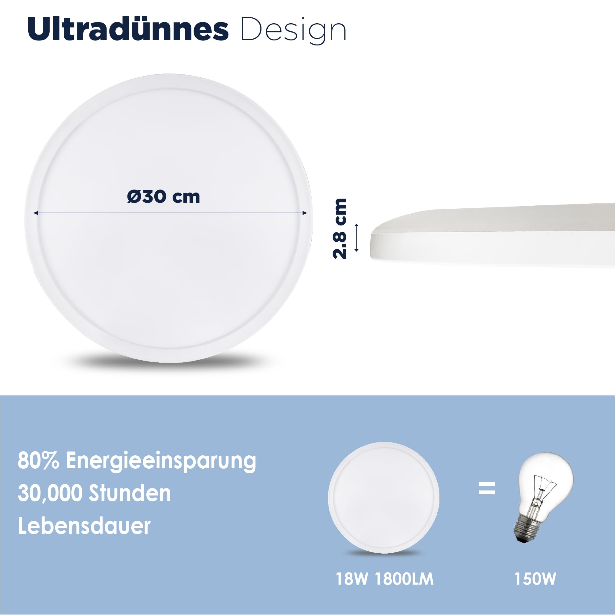 - Ultradünnes Design: led deckenleuchte flach, Abmessungen Ø 30 cm x 2.8 cm; Mit einer Dicke von nur 2,8 cm eignen sie sich perfekt für Räume mit niedrigen Decken; Dieses ultradünne und runde Design passt zu verschiedenen Inneneinrichtungsstilen wie Wohnzimmer, Schlafzimmer, Küche, Esszimmer, Flur, Balkon, Treppenhaus, Lagerhaus usw