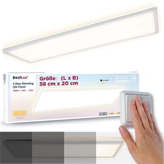 BestLuz Deckenlampe LED Deckenleuchte 580x200x28mm (LxBxH) Dreistufige Dimmbar Rechteckig LED Panel Ultra Flach 3000LM 24W Neutralweiss 4000K mit Backlight für Badezimmer Schlafzimmer Wohnzimmer Küche