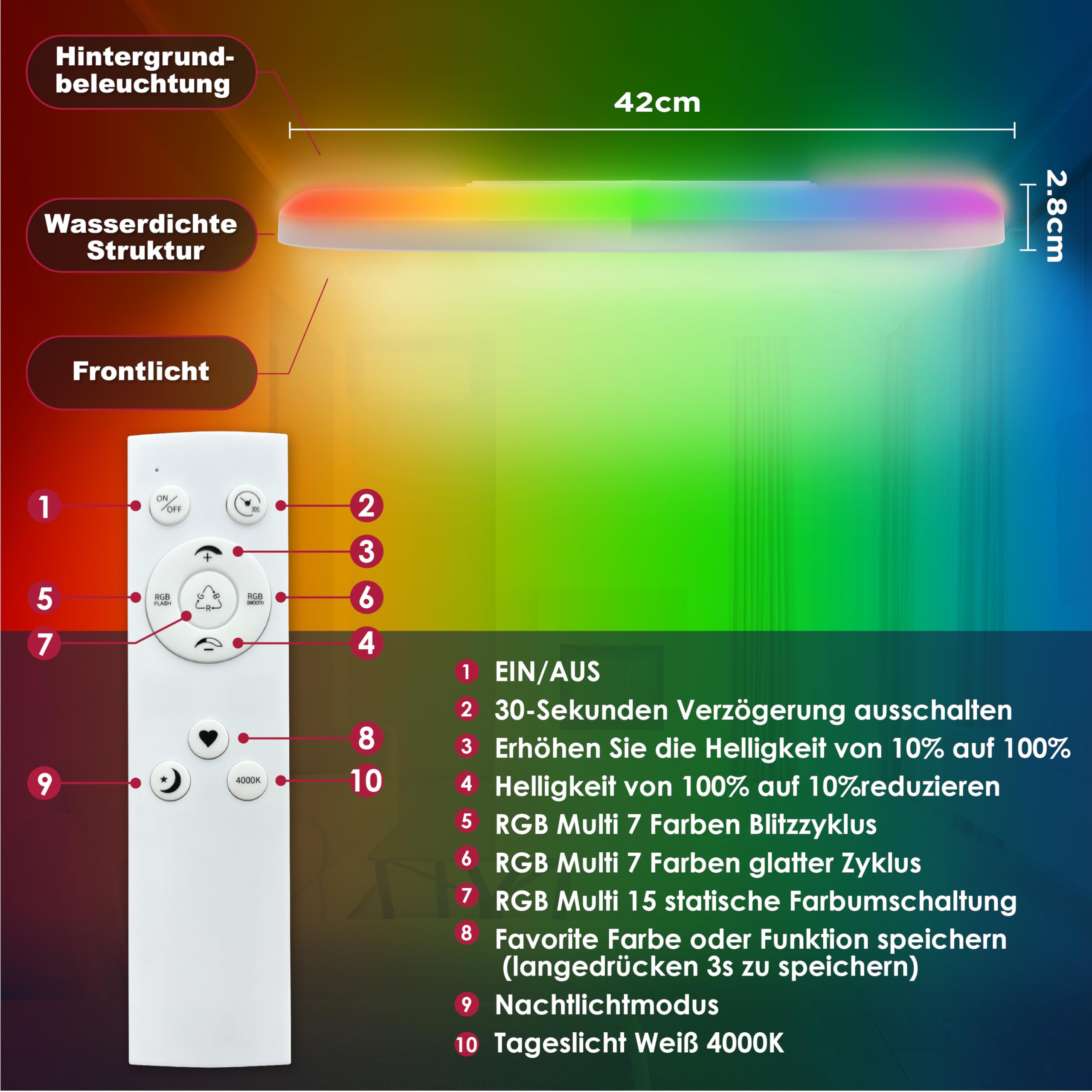 BestLuz LED Deckenleuchte LED Panel Deckenlampe Ø 42cm 24W RGBW + Neutralweiss 4000K mit Backlight-Effekt Fernbedienung für Badezimmer Schlafzimmer Wohnzimmer Küche, Ultra Dünn