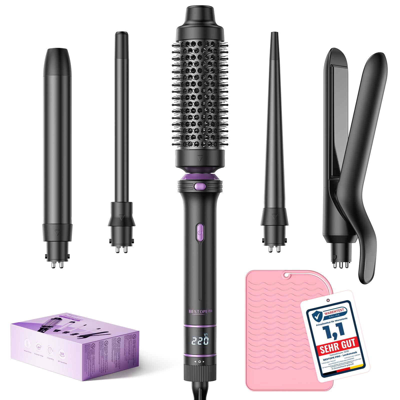 BESTOPE PRO Lockenstab, 5 in 1 Lockenstäbe Set mit Glätteisen, Thermobürste, 3 Keramische Lockeneisen (0,35"-1") für Grosse Locken, 13 Temperaturen, Hair Curler mit Hitzebest.Matte, Handschuh, Klammer