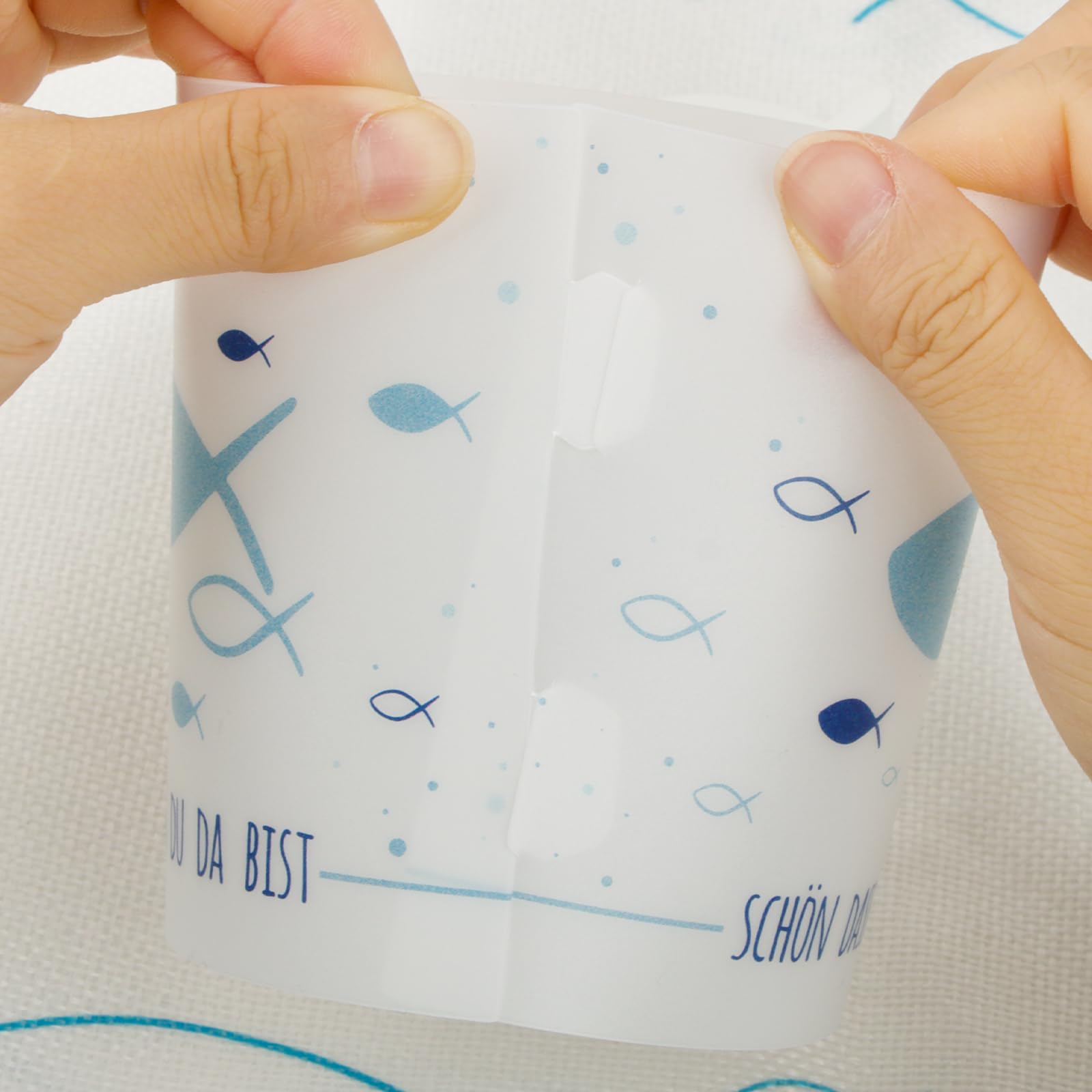 1. Ein Hingucker für eure Festtafel. Mit dem Schriften „Schön, dass du da bist “, Regenbogen, Lebensbaum und kleinen Fischen verziert.