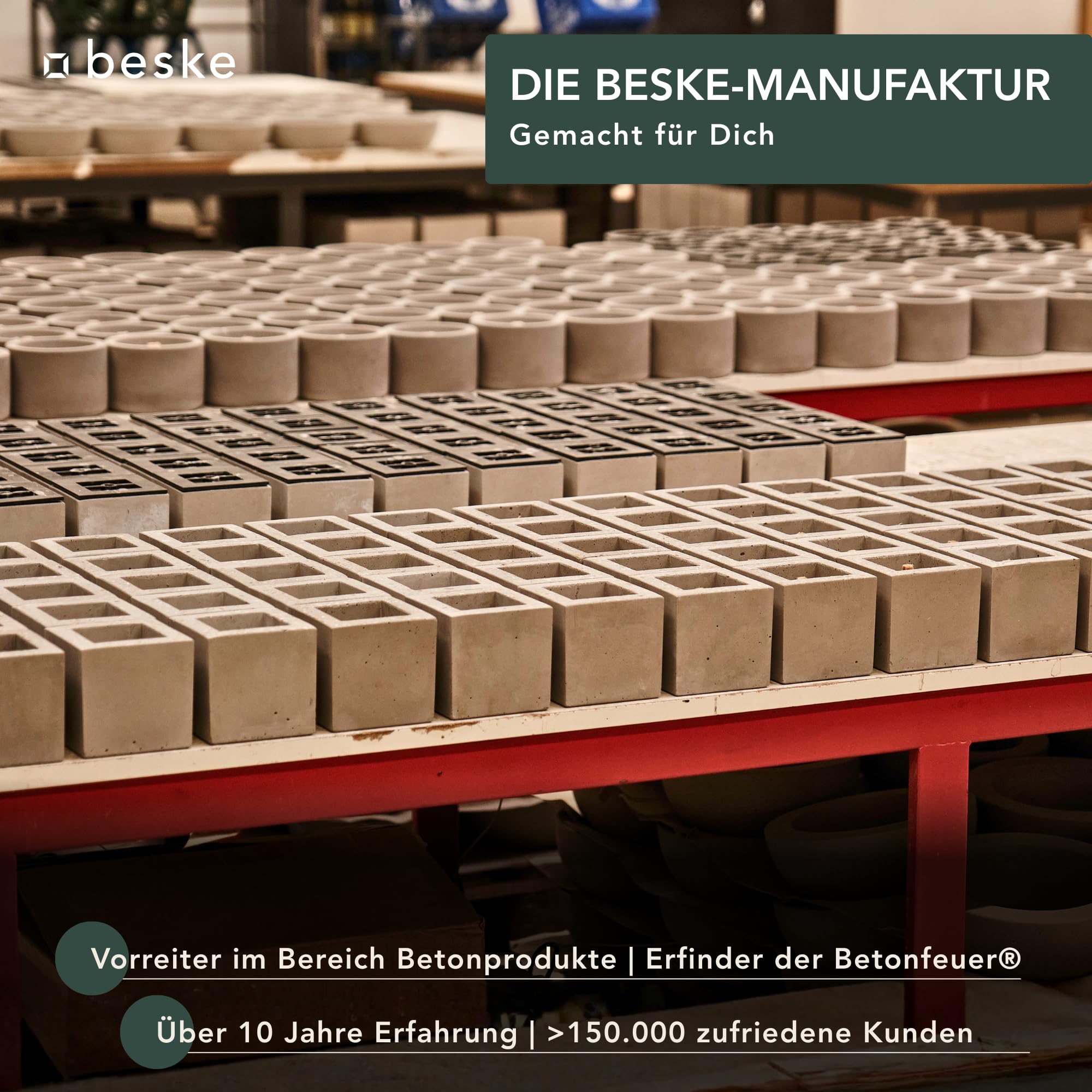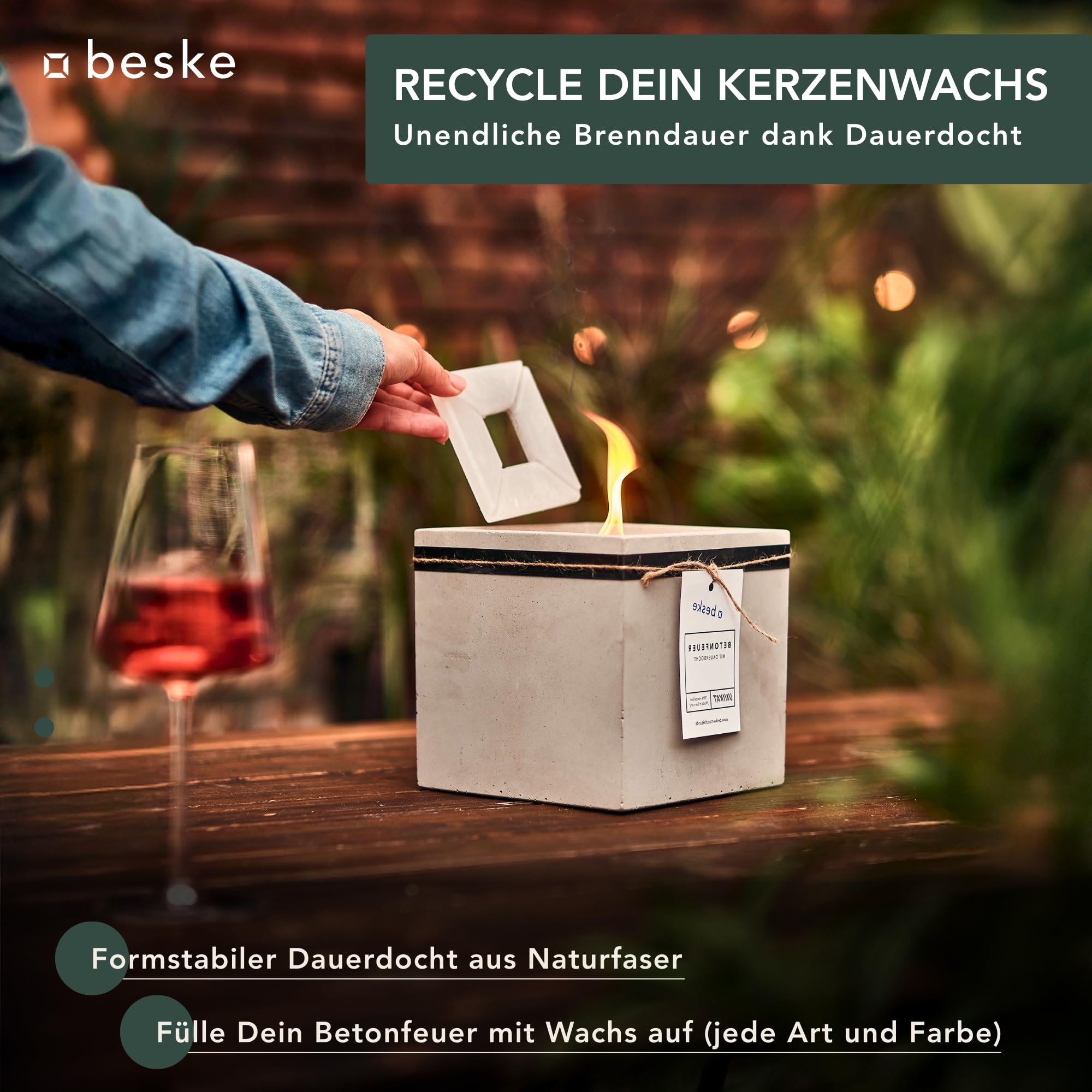 KEINE WACHSRESTE - KEIN PROBLEM: All inclusive - Im Set mit einem Paket passenden Nachfüllwachs-Platten kann Dein neues Betonfeuer sofort in Betrieb genommen werden.DIE BESKE-MANUFAKTUR - 100% HANDARBEIT MADE IN GERMANY: Wir haben uns dazu verpflichtet unsere Produkte selber zu fertigen und dabei nur die besten Materialien zu verwenden.WEIT ÜBER 100.000 VERKAUFTE BETONFEUER: Innovation und Handwerk seit 2016. Weit mehr als 100.000 zufriedene Kunden schätzen die Qualität und den Kundenservice der Beske-Manufaktur.DAS BETONFEUER: Unsere Betonfeuer sind ein für den Aussenbereich entworfenens Produkt zur sinnvollen Verwendung von Kerzenresten. Der natürlich abbaubare Dauerdocht verwandelt Kerzenreste in lang anhaltende Lagerfeueratmosphäre. Dieser "ernährt" sich von Wachs. Hat er genügend "Nahrung" hält er ewig. Da die meisten Kerzen nicht komplett runter brennen, Wachs aber sehr teuer ist, ist das Betonfeuer die perfekt Lösung. Kerzenreste einfach mit in die Brennkammer legen - fertig.BITTE BEACHTEN: Nur in Aussenbereichen anwenden! Bei der Grösse des Dochtes und damit auch der Flamme ist eine gewisse Russbildung leider nicht zu verhindern. Unser Betonfeuer wurde entworfen um wie ein kleines Lagerfeuer zu brennen. Ein kleiner Nachteil der grossen Flamme ist leider die erhöhte Bildung von Russ. Jedem Betonfeuer liegt eine ausführliche Beschreibung der Nutzungs- und Anwendungshinweise bei.HIER KOMMT ES IDEAL ZUR GELTUNG: Aufgrund der verhältnismässig kleinen Brennkammer kann dieses Betonfeuer auch hervorragend auf Tischen eingesetzt werden.