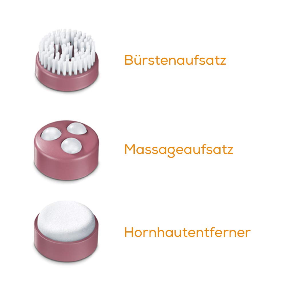 - Pediküre-Aufsätze: Drei wechselbare Aufsätze für eine professionelle Pediküre und Pflege der Füsse, einschliesslich einer Reflexzonen-Massage.