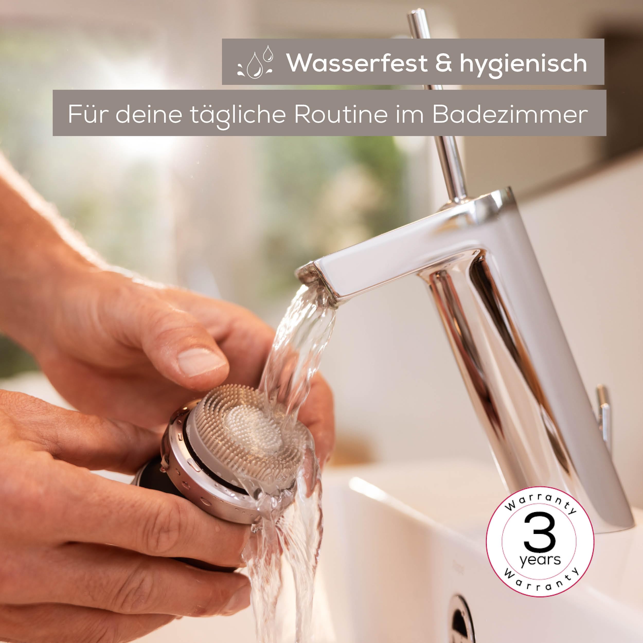 Die Gesichtsbuerste ist wasserfest und kann problemlos im Badezimmer verwendet werden. Der integrierte Akku sorgt fuer kabellose Flexibilitaet und macht das Geraet auch ideal fuer Reisen. Bei regelmaessiger Anwendung fuehlt sich die Haut spuerbar sauberer, weicher und frischer an und ist optimal auf nachfolgende Pflegeprodukte vorbereitet.