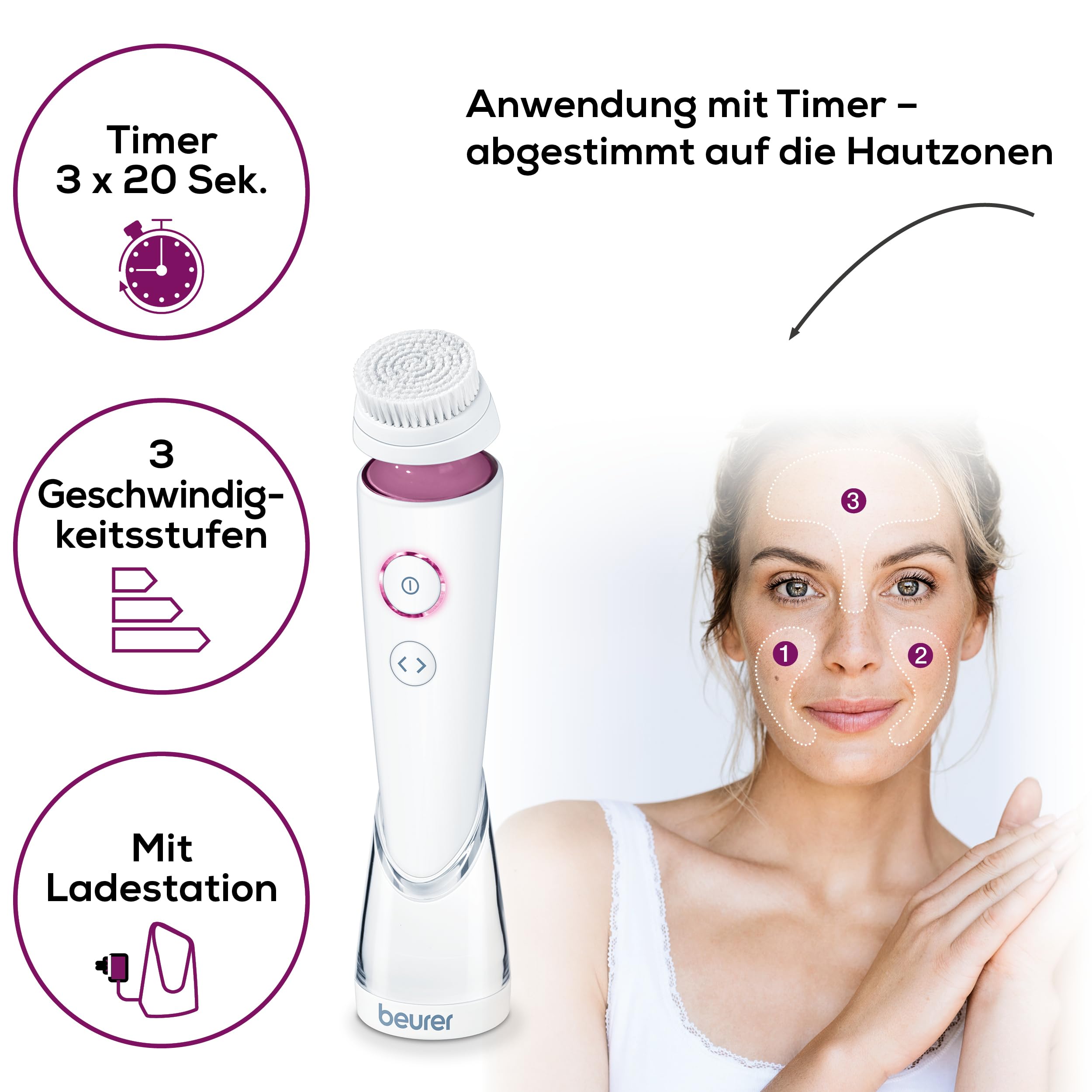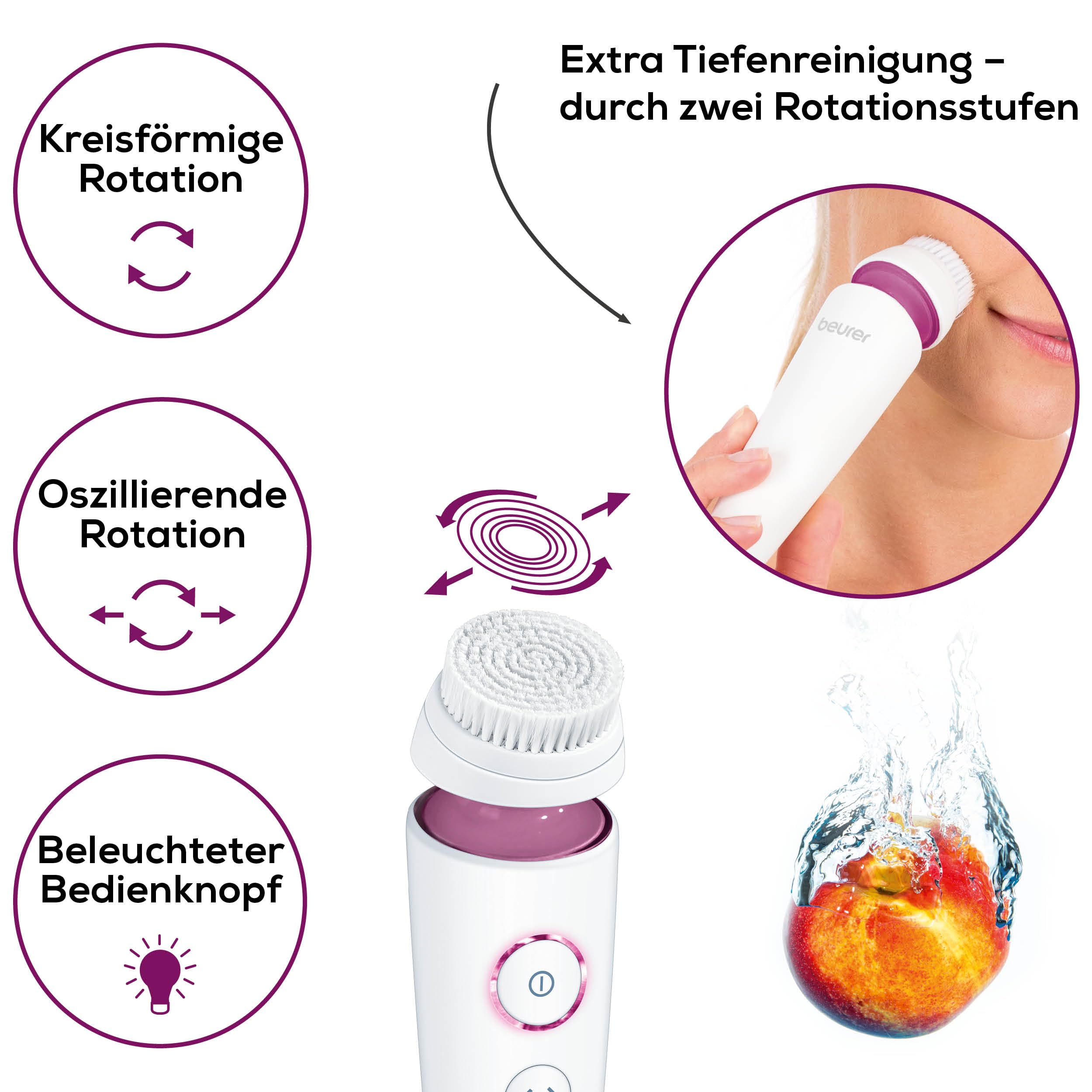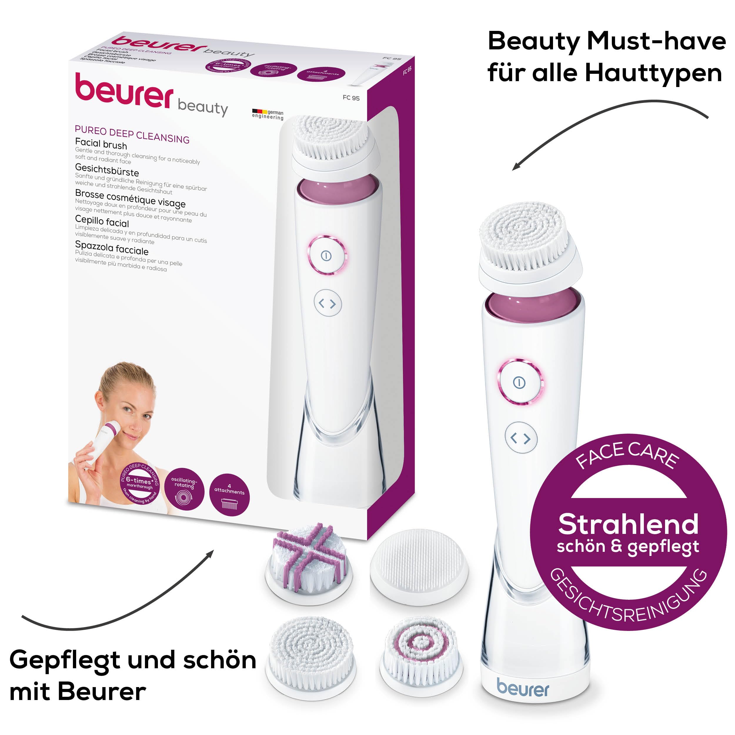 Die Beurer FC 95 Gesichtsbuerste ist ein leistungsstarkes Gesichtspflege-Geraet zur porentiefen Reinigung, das die Haut deutlich gruendlicher reinigt als eine manuelle Gesichtsreinigung. Die elektrische Reinigungsbewegung entfernt effektiv Schmutzpartikel, ueberschuessigen Talg und Make-up-Reste und unterstuetzt ein klaeres, frischeres Hautbild.