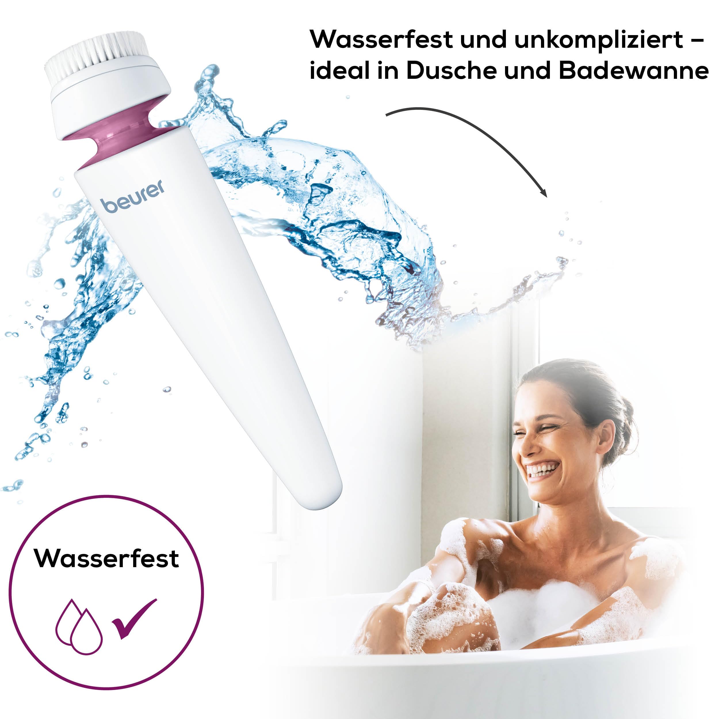 Die wasserfeste Verarbeitung macht die Gesichtsbuerste ideal fuer die taegliche Anwendung im Bad. Der integrierte Akku sorgt fuer kabellose Freiheit und komfortable Handhabung. Zudem wird die Haut optimal auf nachfolgende Pflegeprodukte vorbereitet, da Seren und Cremes besser aufgenommen werden koennen.