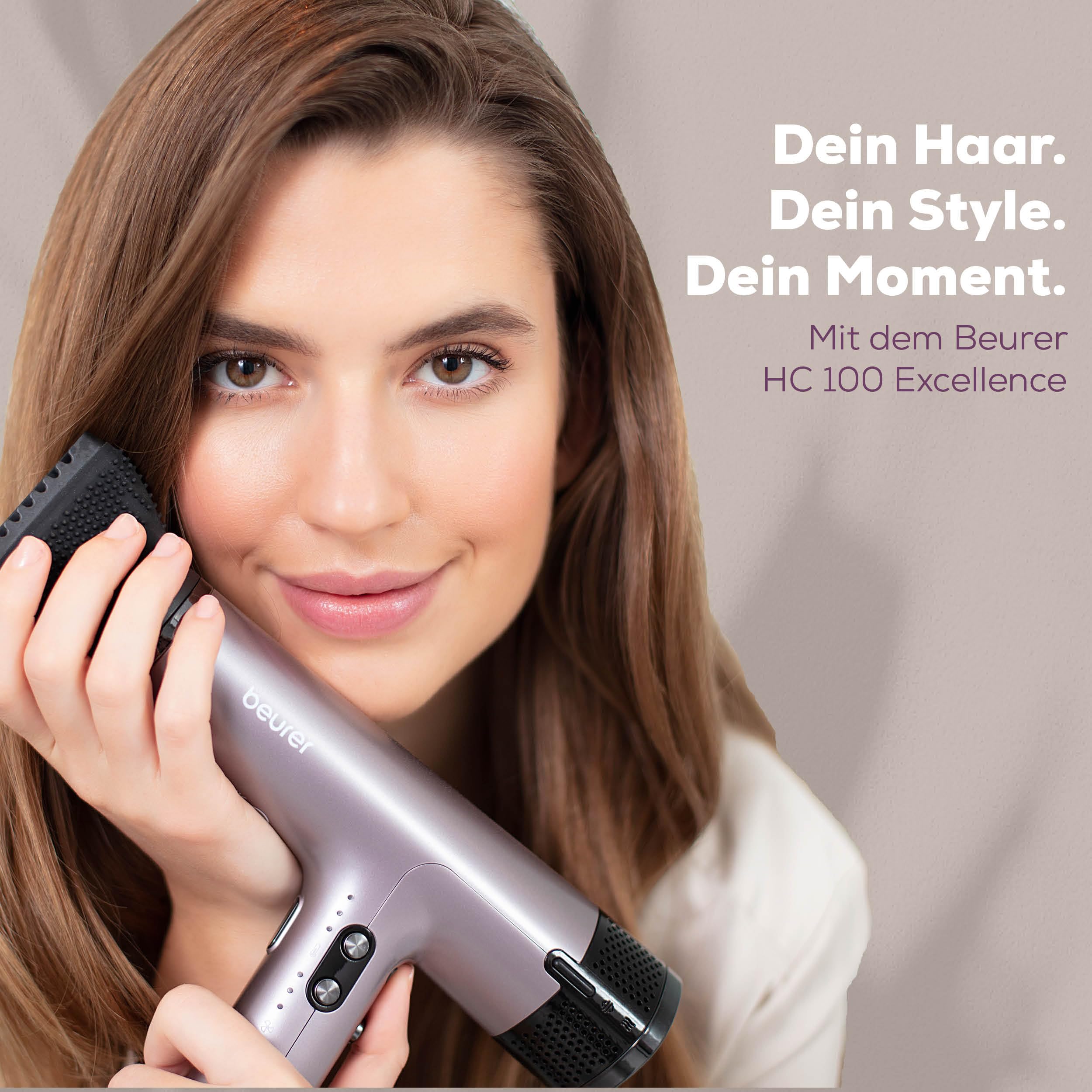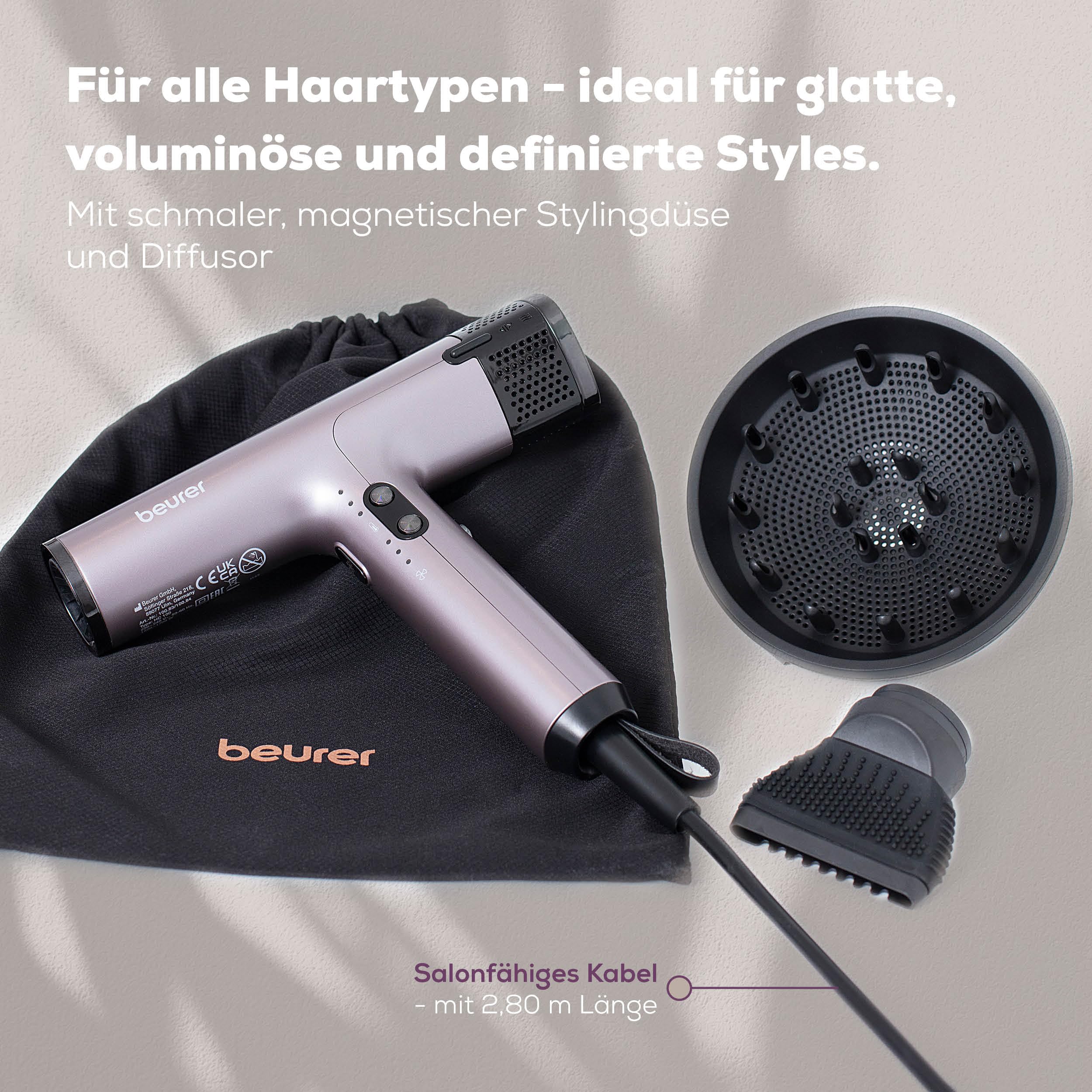 Beurer HC 100 Excellence Haartrockner, Föhn mit kraftvollem Digitalmotor, trocknet bis zu 20% schneller, leichtes Gewicht, besonders leise, Ionenfunktion für glänzendes Haar, inkl. Volumendiffusor