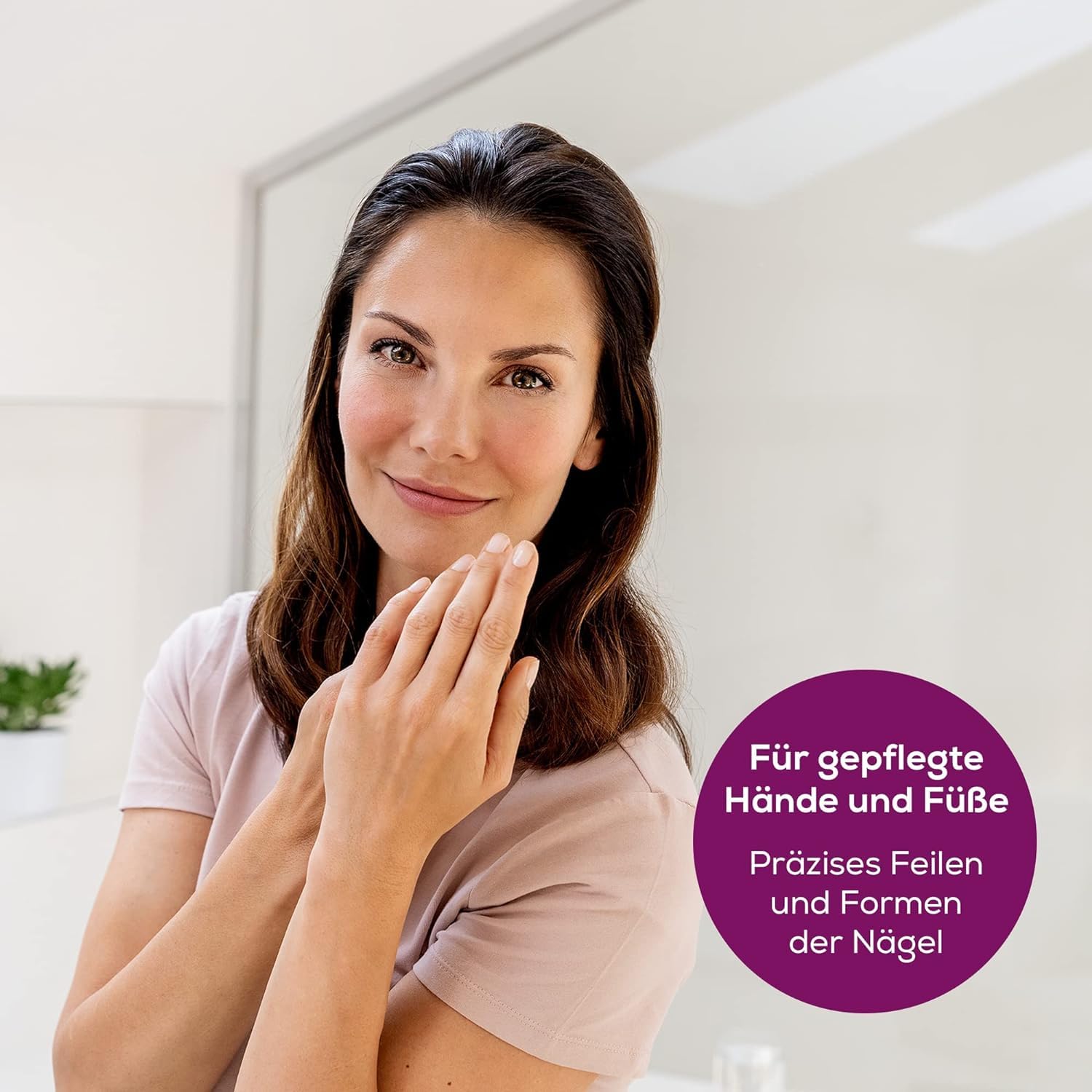 Dank der ergonomischen Form liegt das Manikueregeraet sicher und angenehm in der Hand. Dies ermoeglicht eine kontrollierte und praezise Anwendung, auch bei laengeren Pflegeroutinen. Die stufenlos einstellbare Drehzahl zwischen 6.000 und 15.000 Umdrehungen pro Minute erlaubt es, die Leistung individuell an die eigenen Beduerfnisse und an unterschiedliche Pflegebereiche anzupassen.