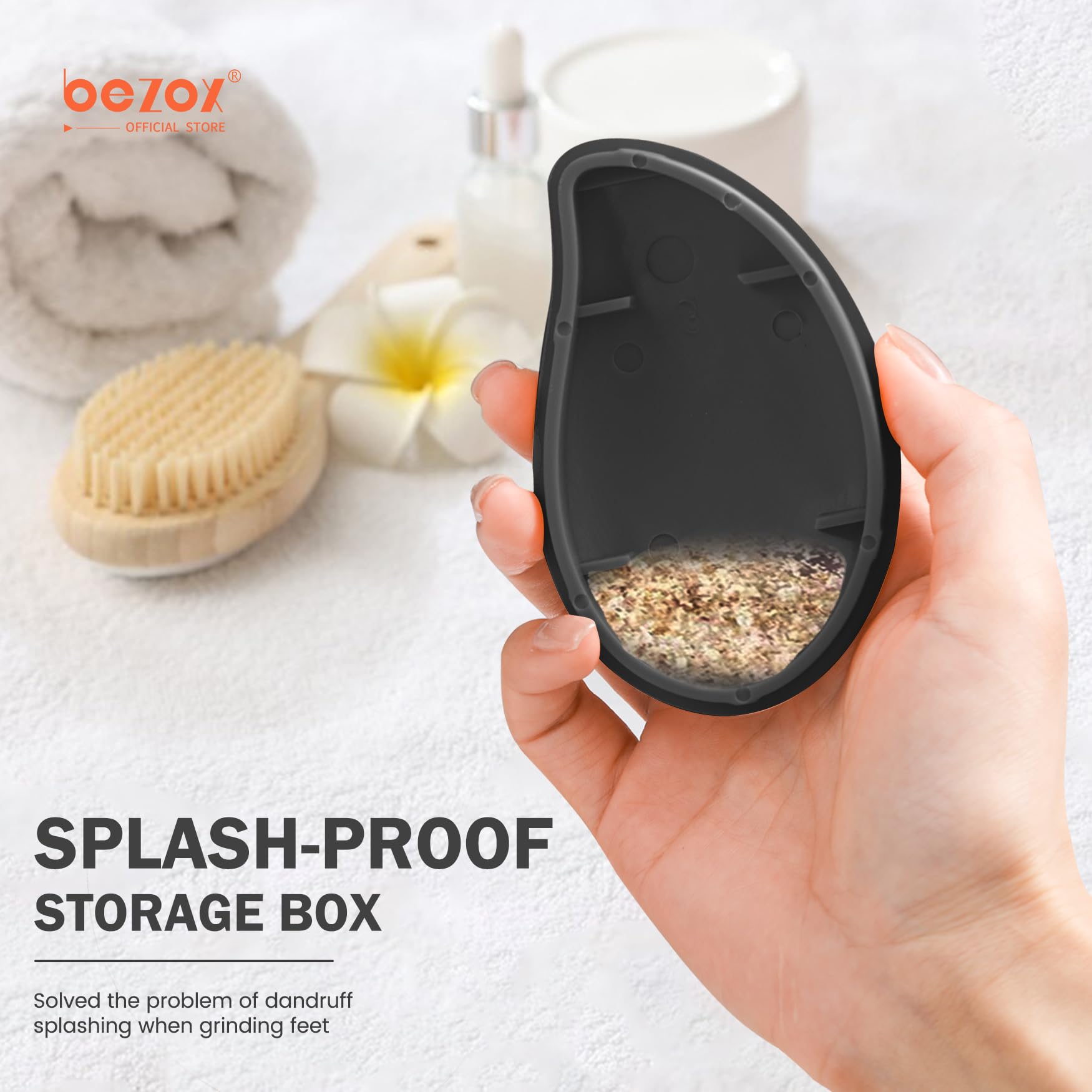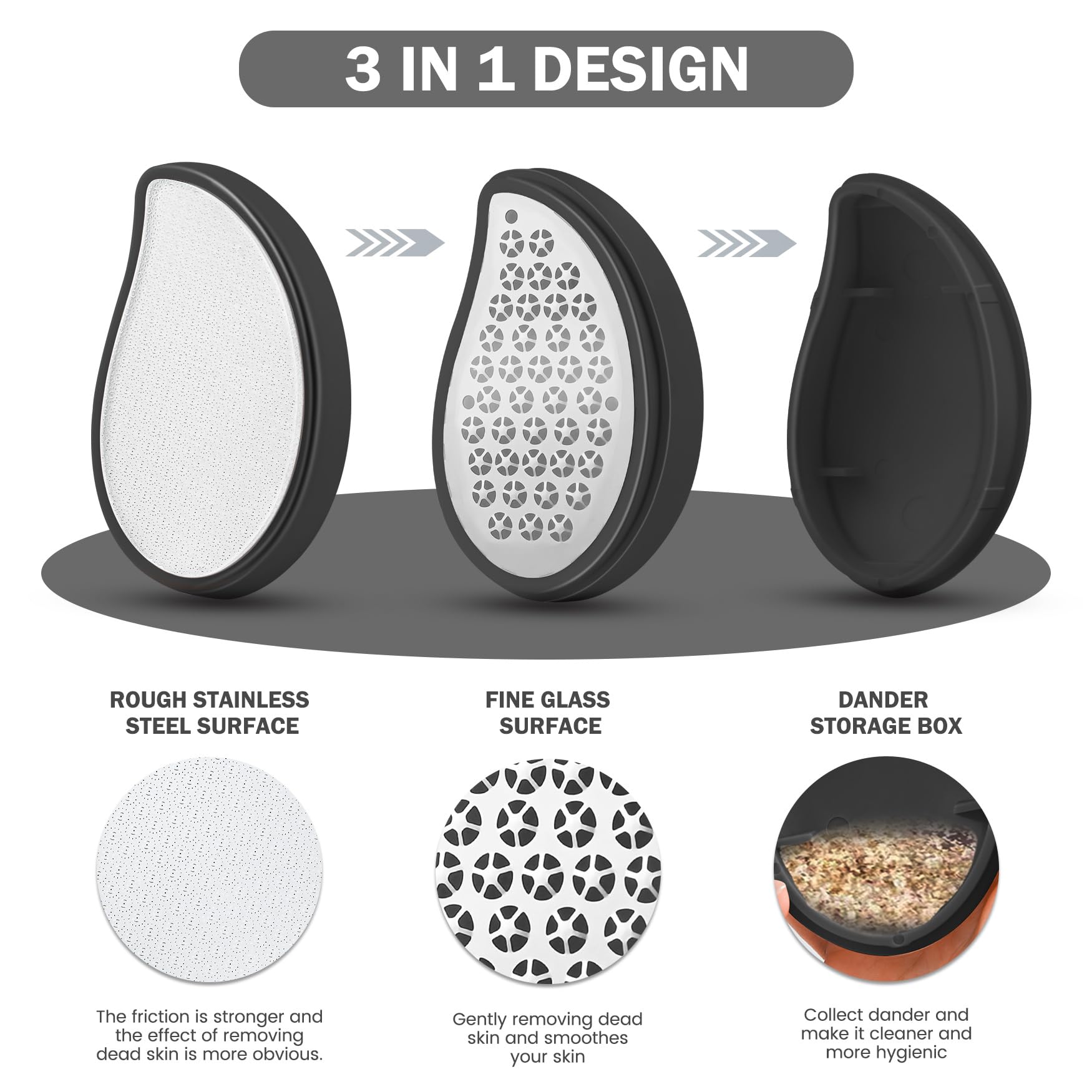 • Schmutzaufbewahrungsbox: Die Aufbewahrungsbox und die Fussfeile sind in einem Design integriert, das den Schmutz beim Gebrauch direkt auffangen kann, das Verstreuen von Schmutz verhindert und sauber und hygienisch hält.